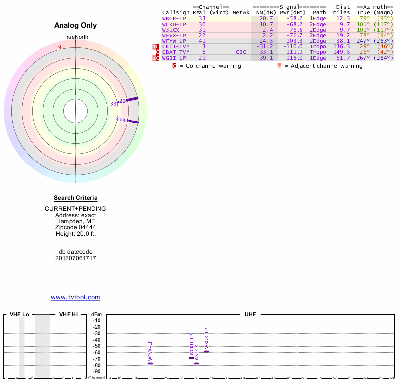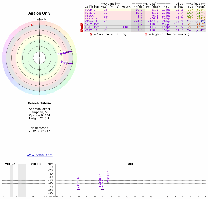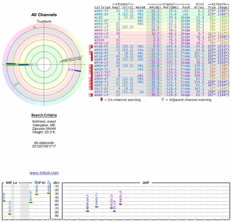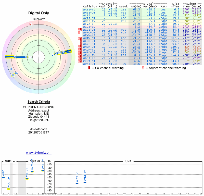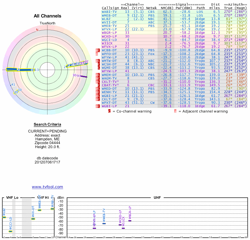 Here are the results for your location. The transmitter database was last updated on June 7, 2013. For more information about these plots and how to interpret them, please check out the Signal Analysis FAQ.