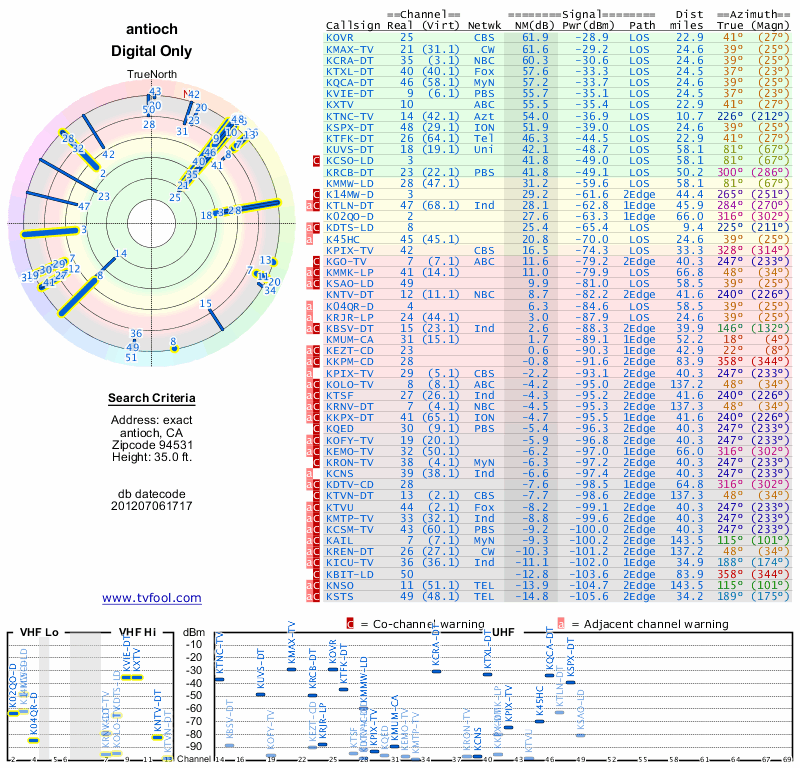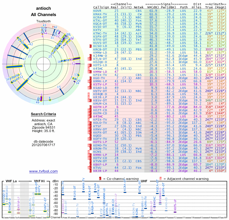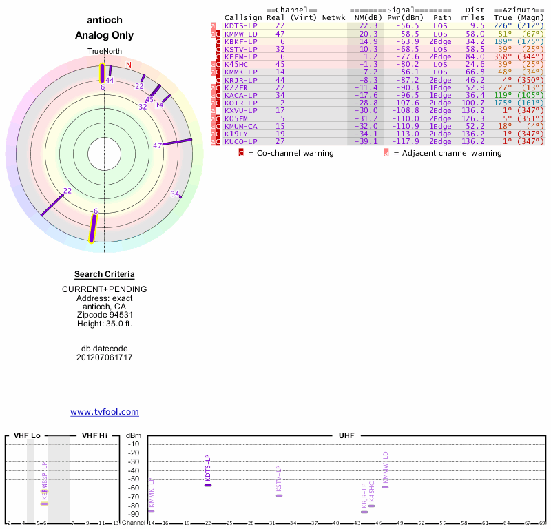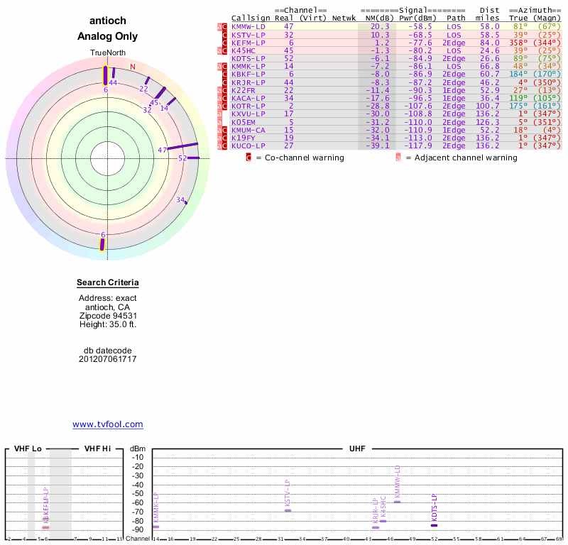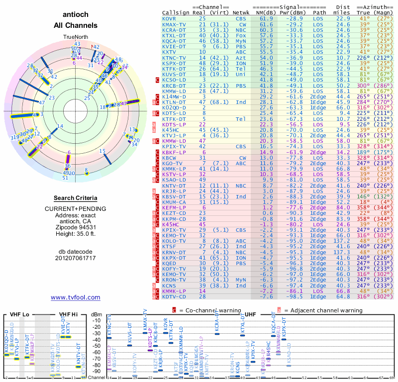 Here are the results for your location. The transmitter database was last updated on June 7, 2013. For more information about these plots and how to interpret them, please check out the Signal Analysis FAQ.