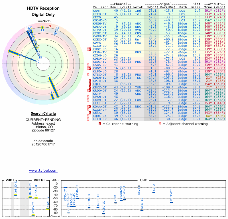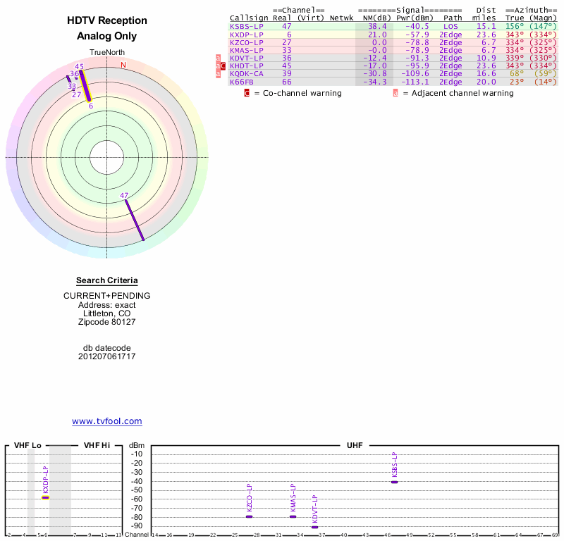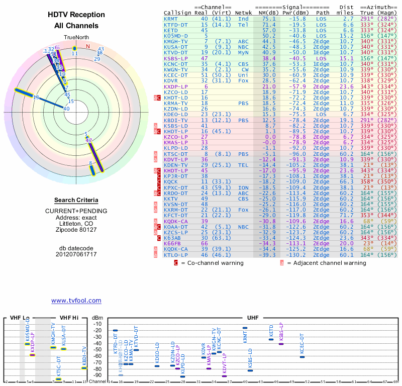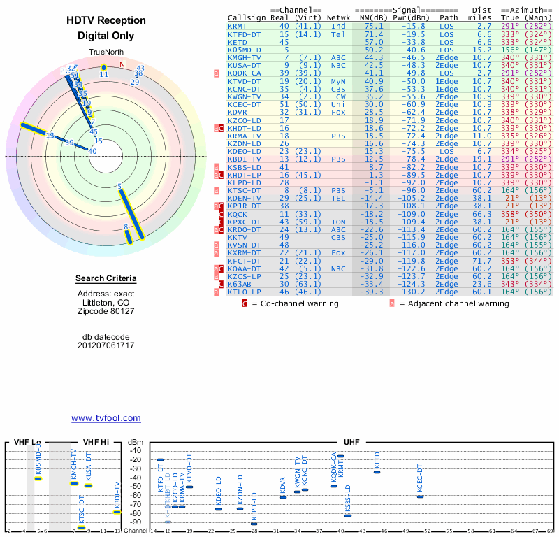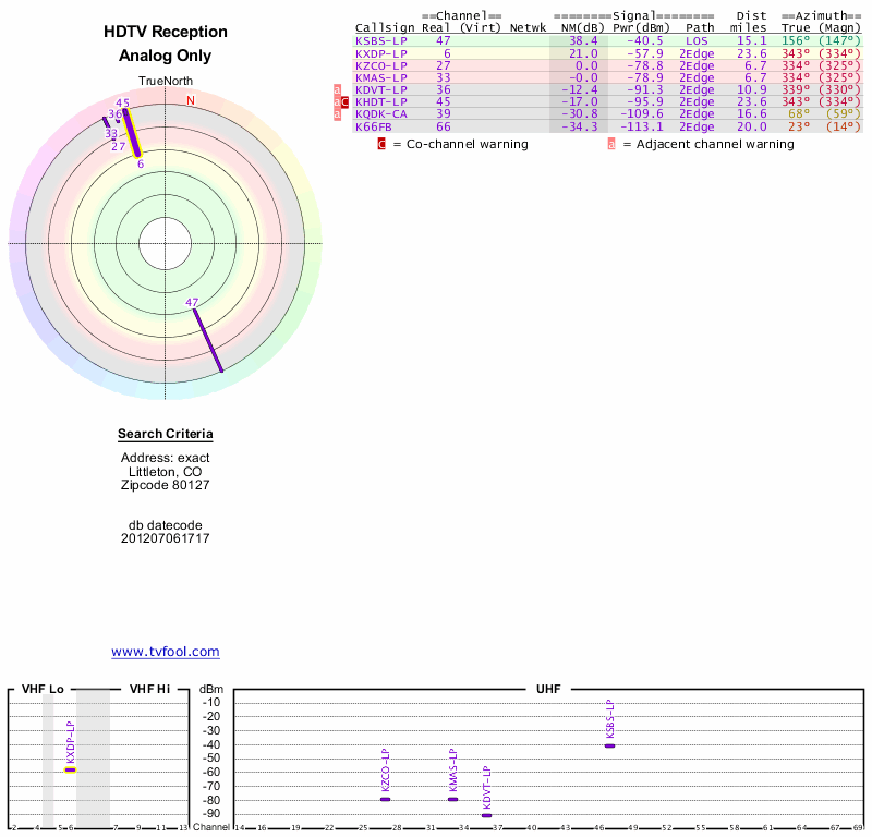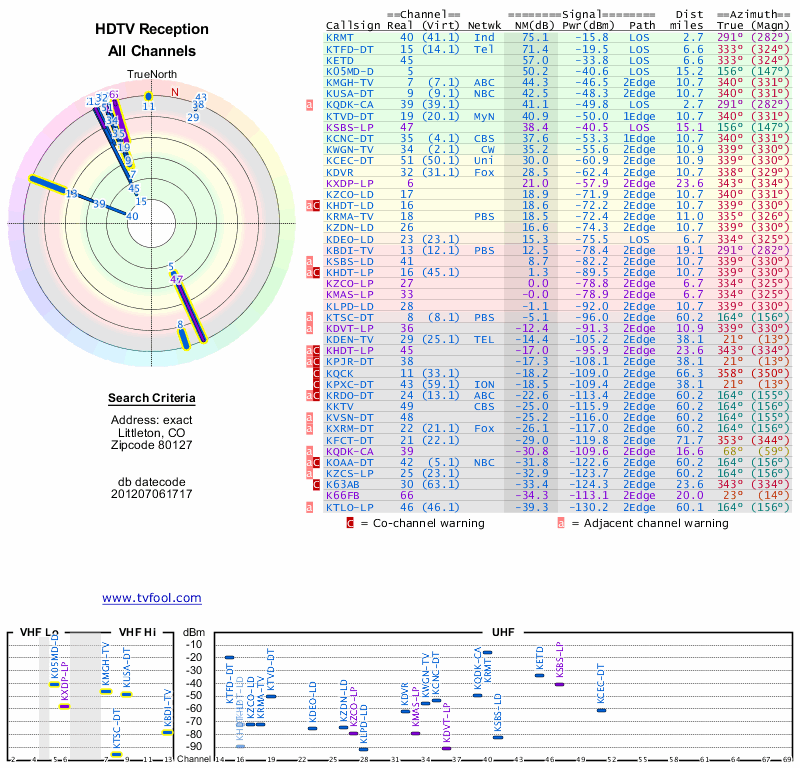Here are the results for your location. The transmitter database was last updated on June 7, 2013. For more information about these plots and how to interpret them, please check out the Signal Analysis FAQ.