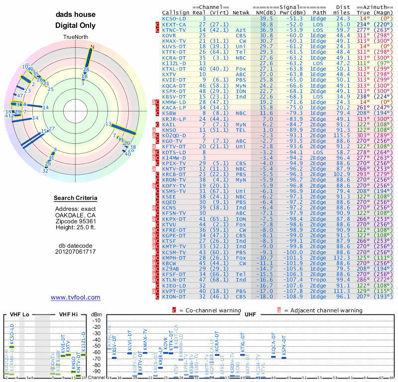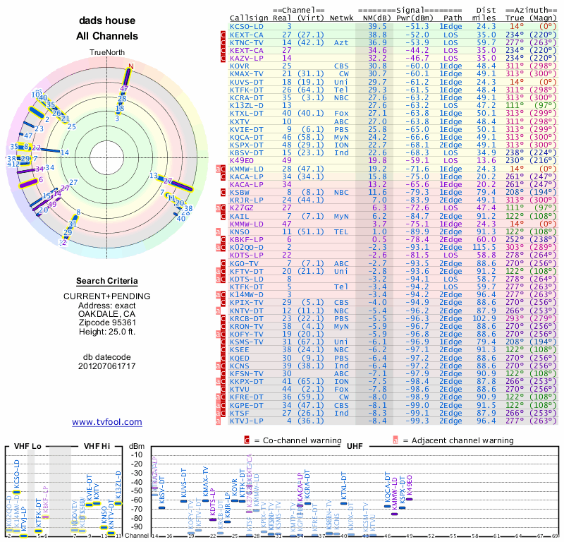 Here are the results for your location. The transmitter database was last updated on June 7, 2013. For more information about these plots and how to interpret them, please check out the Signal Analysis FAQ.