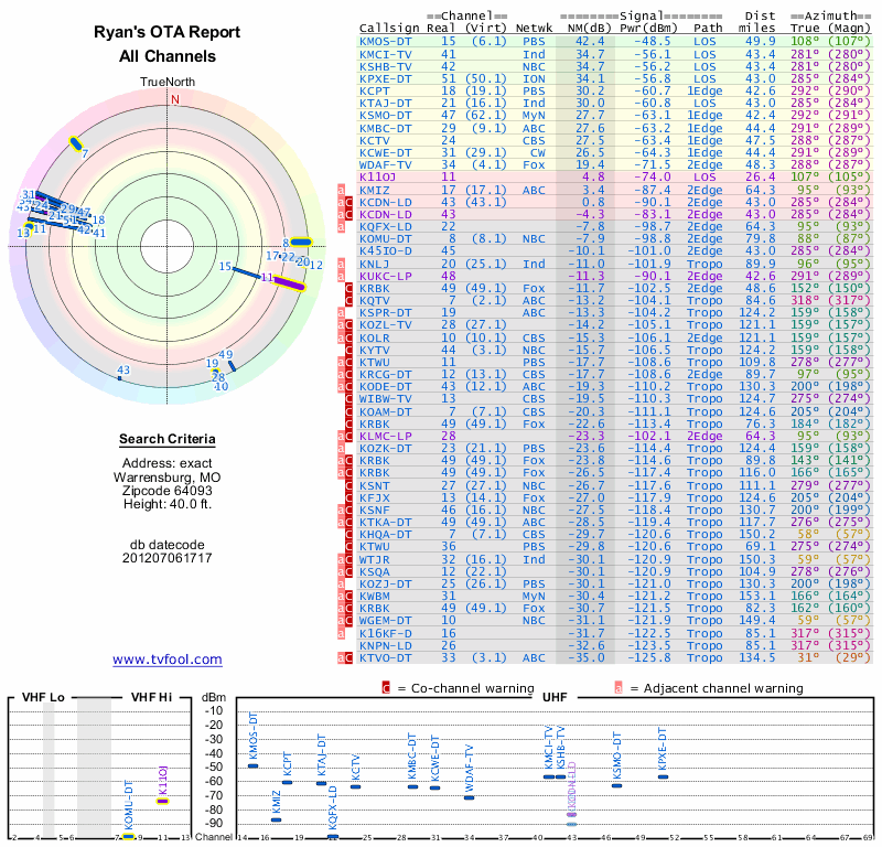 Here are the results for your location. The transmitter database was last updated on June 7, 2013. For more information about these plots and how to interpret them, please check out the Signal Analysis FAQ.