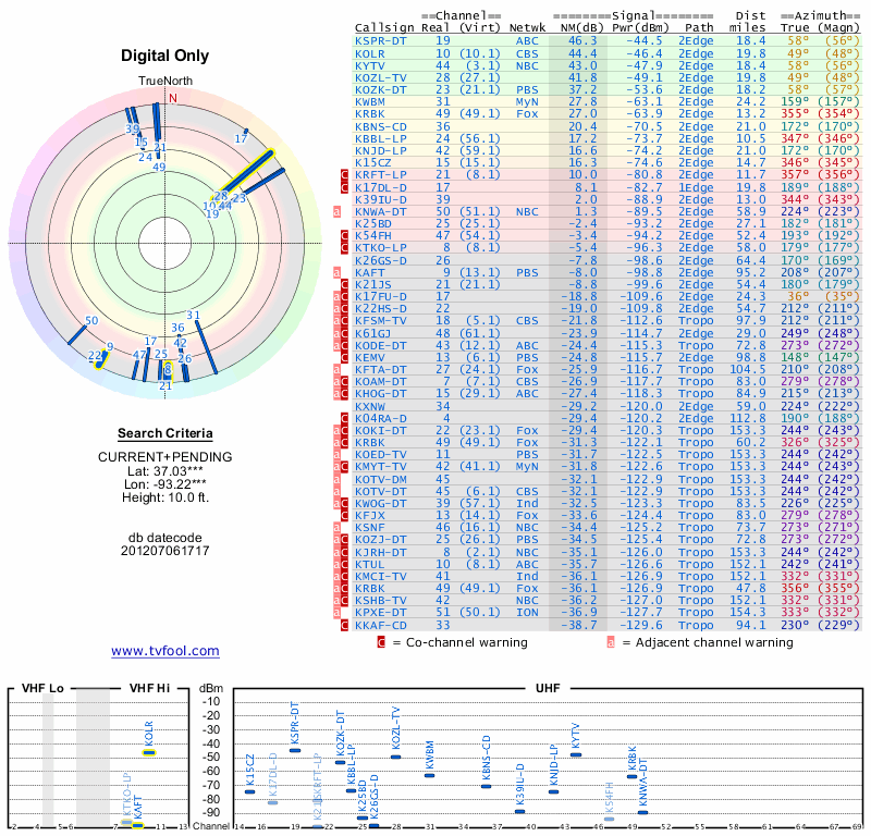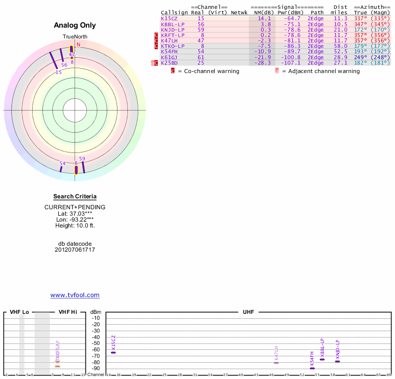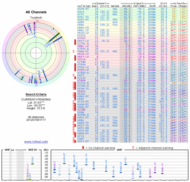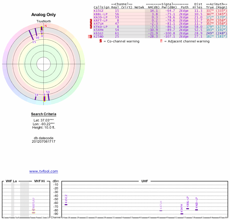 Here are the results for your location. The transmitter database was last updated on June 7, 2013. For more information about these plots and how to interpret them, please check out the Signal Analysis FAQ.