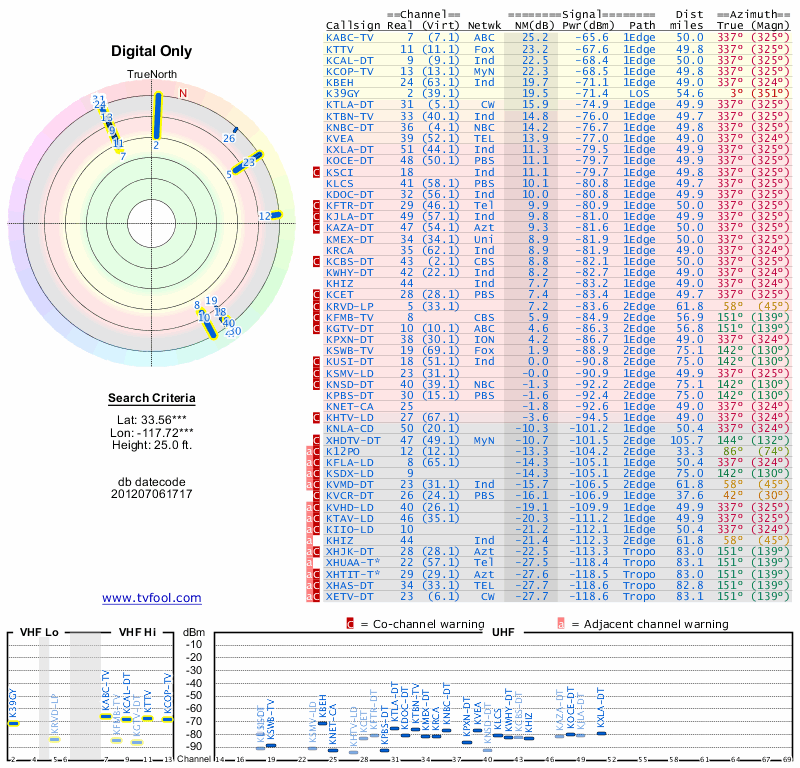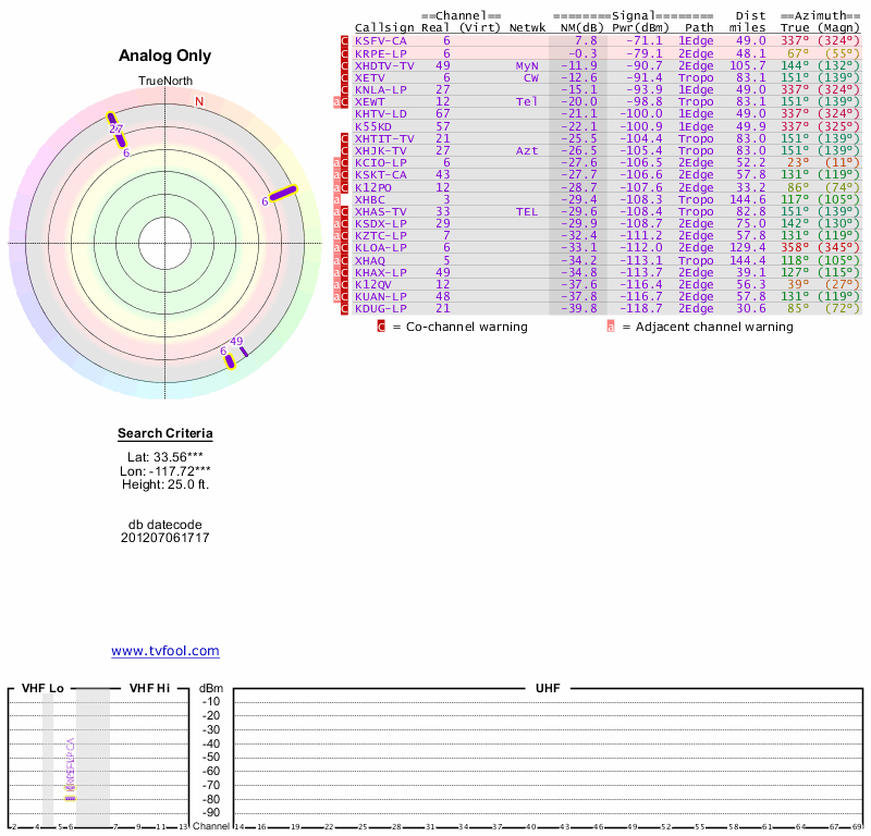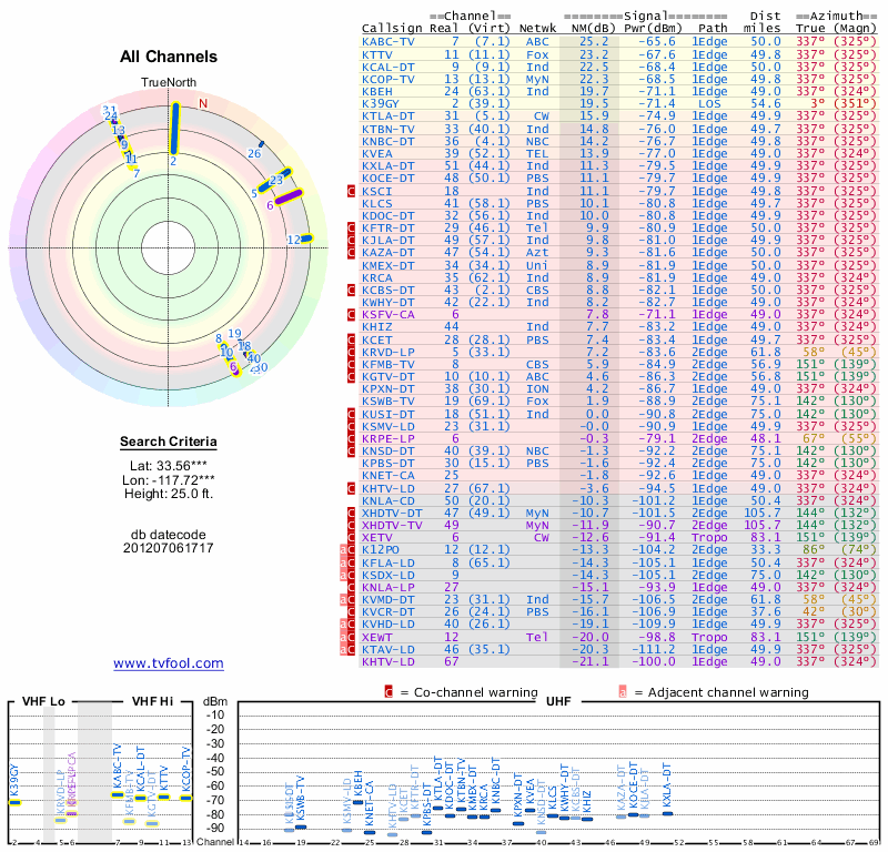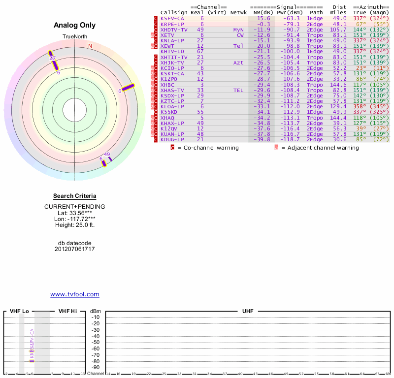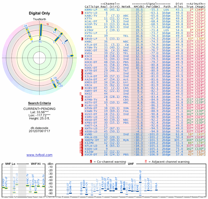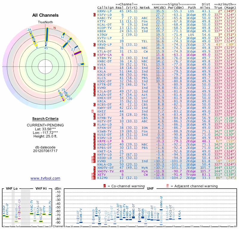 Here are the results for your location. The transmitter database was last updated on June 7, 2013. For more information about these plots and how to interpret them, please check out the Signal Analysis FAQ.