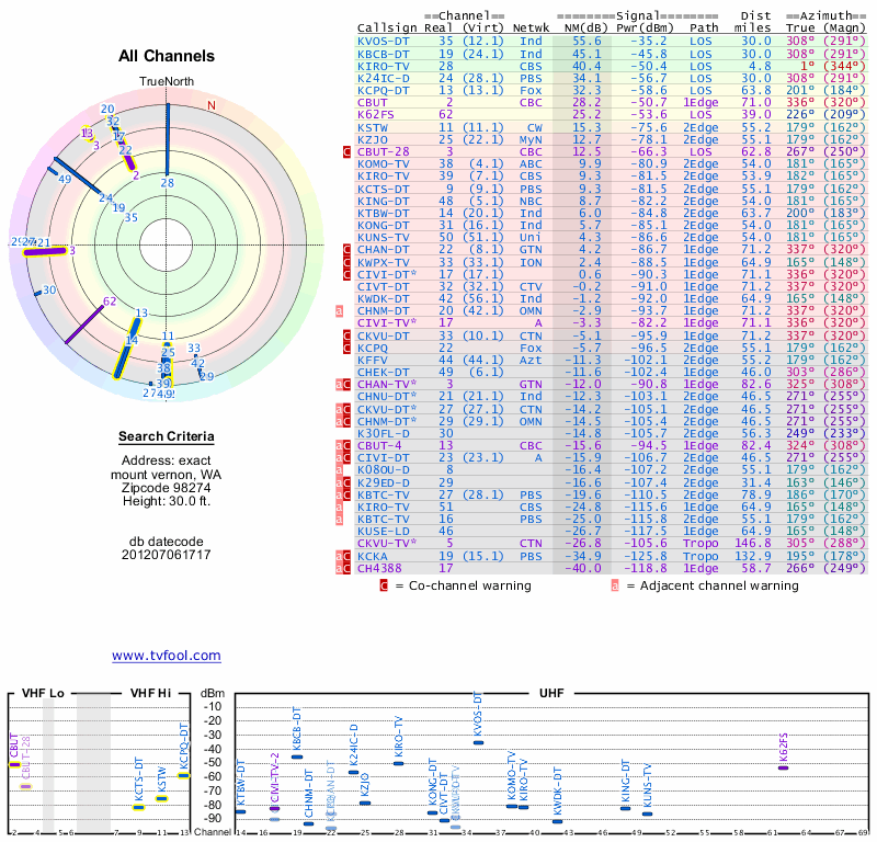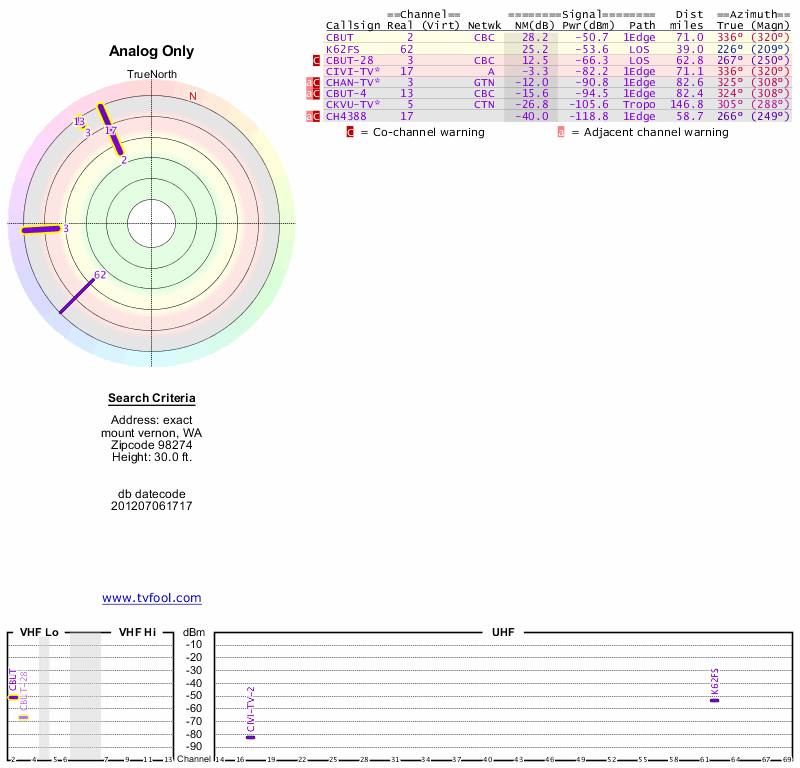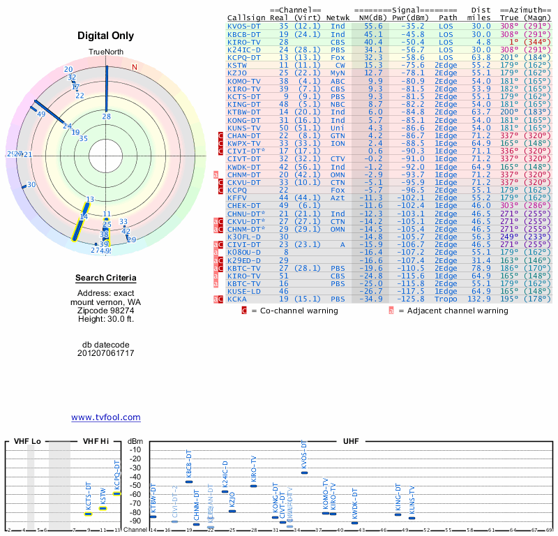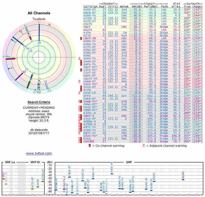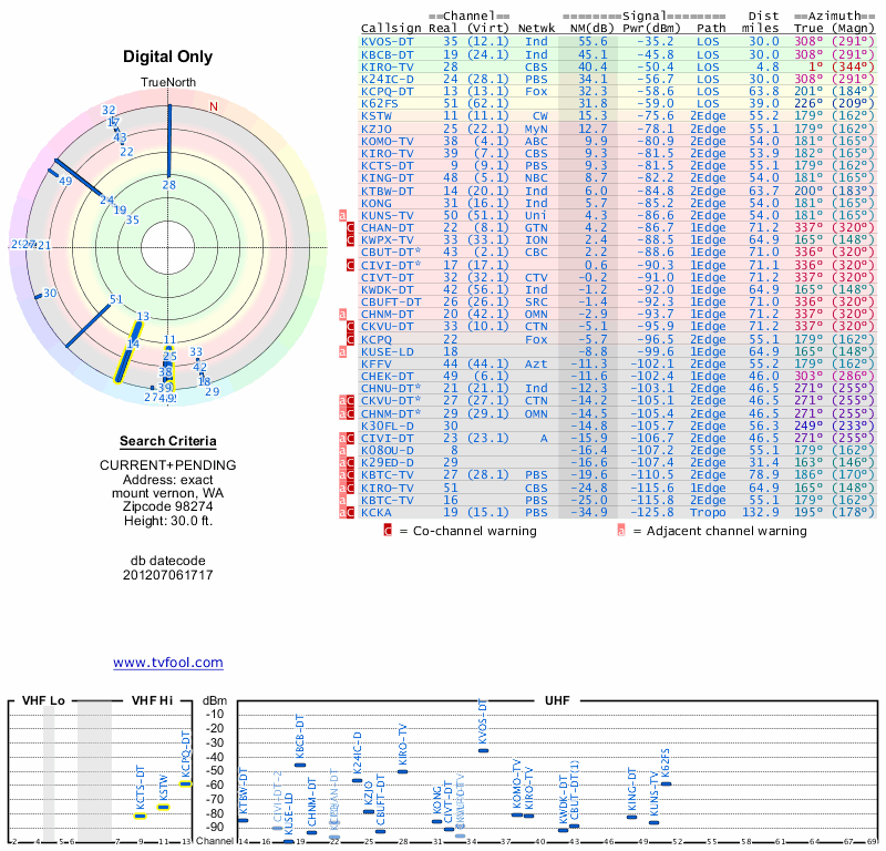 Here are the results for your location. The transmitter database was last updated on June 7, 2013. For more information about these plots and how to interpret them, please check out the Signal Analysis FAQ.