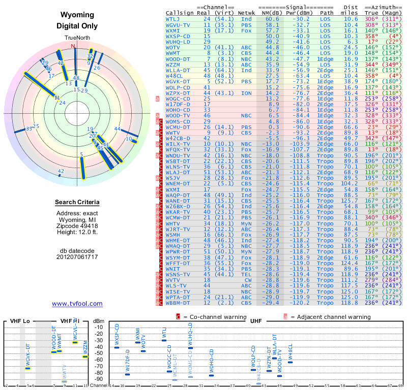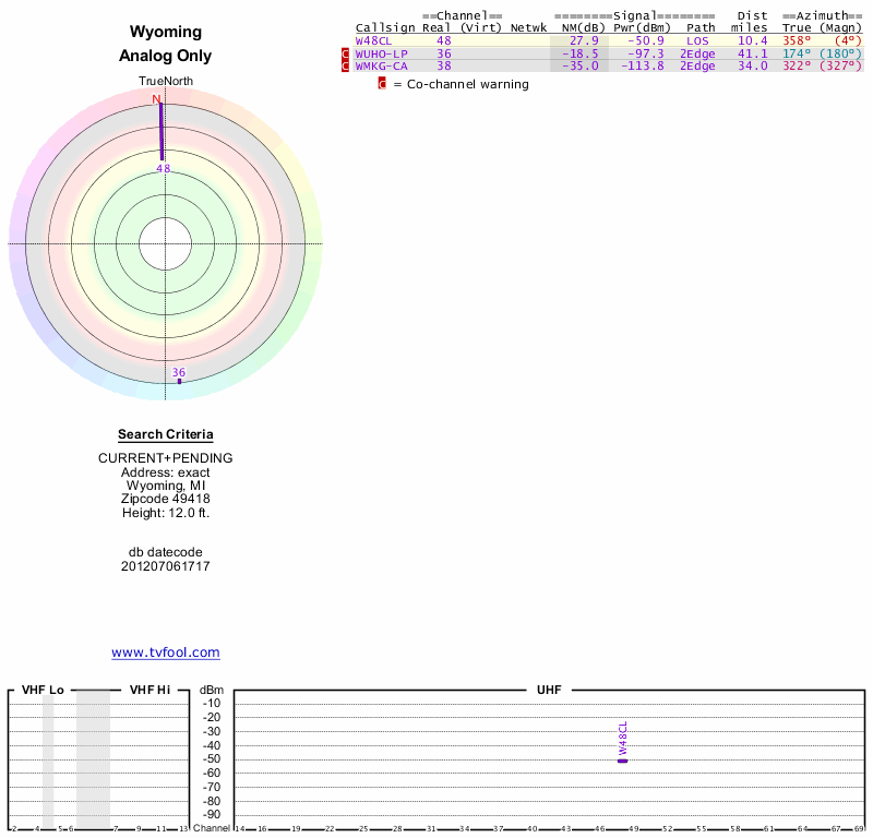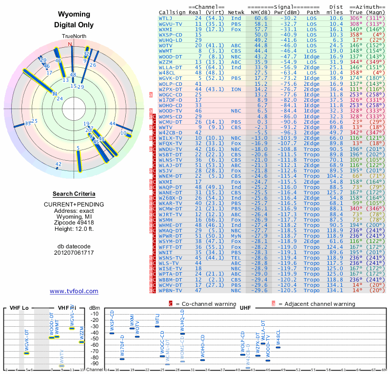 Here are the results for your location. The transmitter database was last updated on June 7, 2013. For more information about these plots and how to interpret them, please check out the Signal Analysis FAQ.