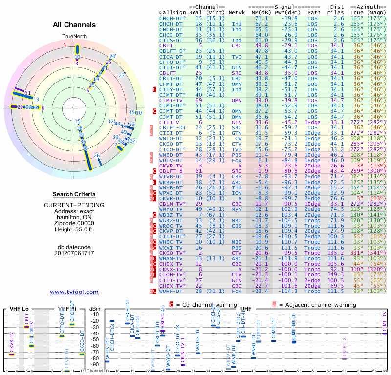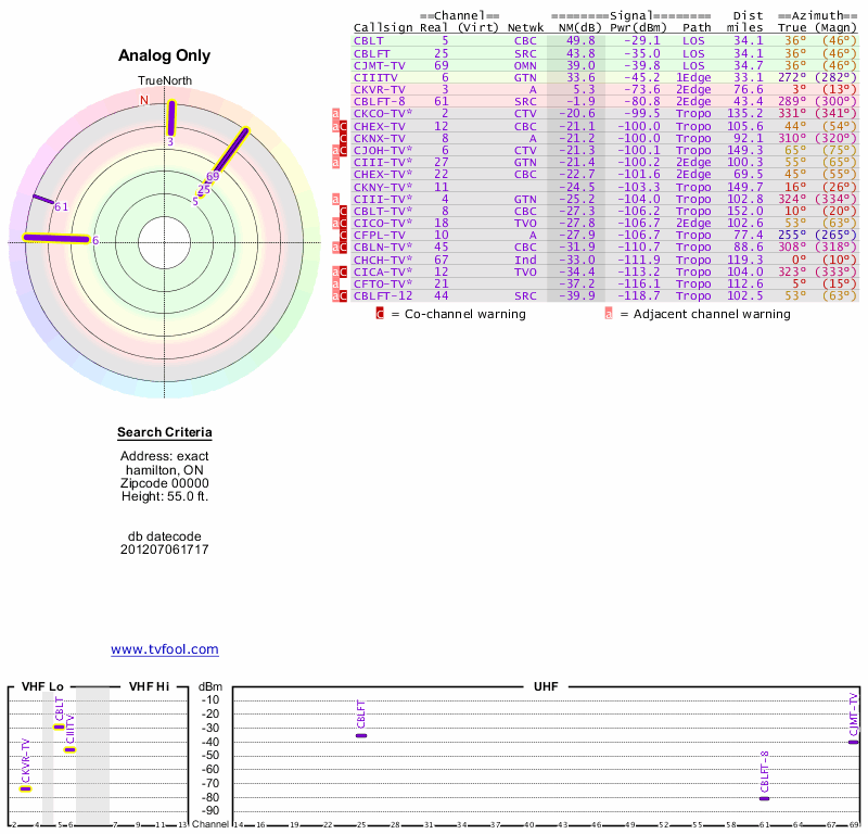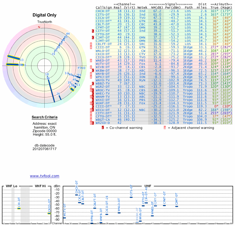 Here are the results for your location. The transmitter database was last updated on June 7, 2013. For more information about these plots and how to interpret them, please check out the Signal Analysis FAQ.