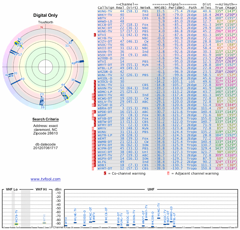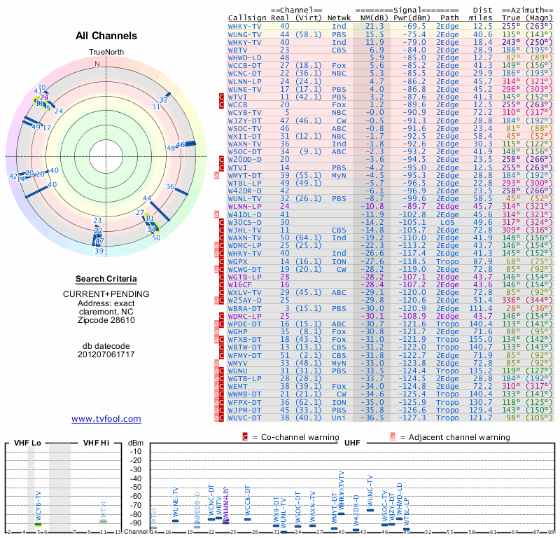 Here are the results for your location. The transmitter database was last updated on June 7, 2013. For more information about these plots and how to interpret them, please check out the Signal Analysis FAQ.