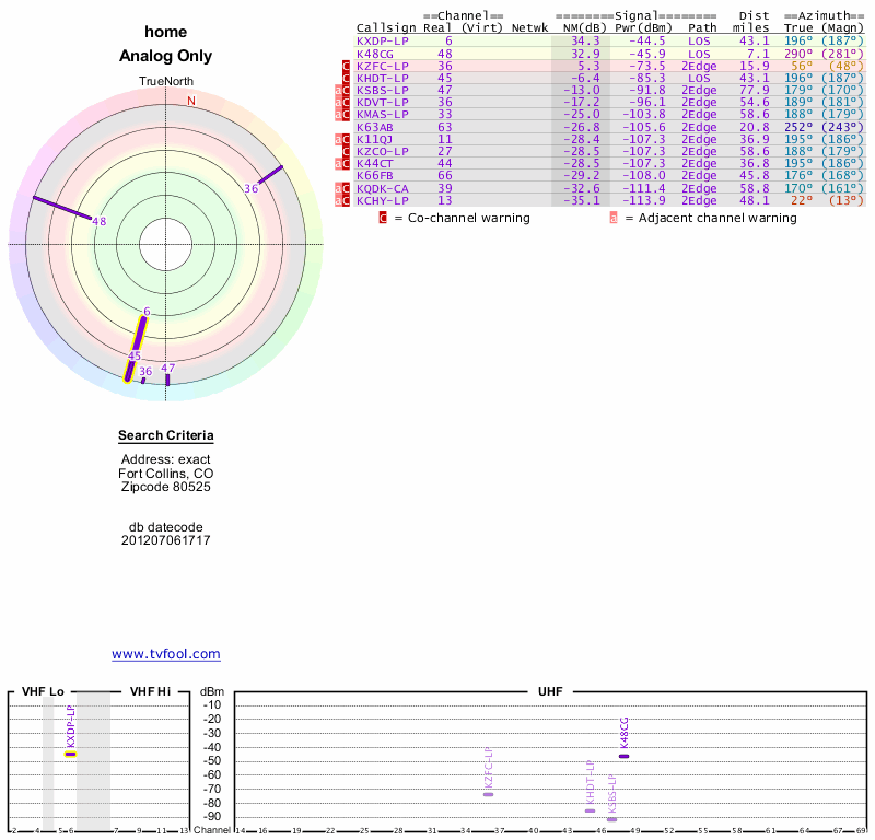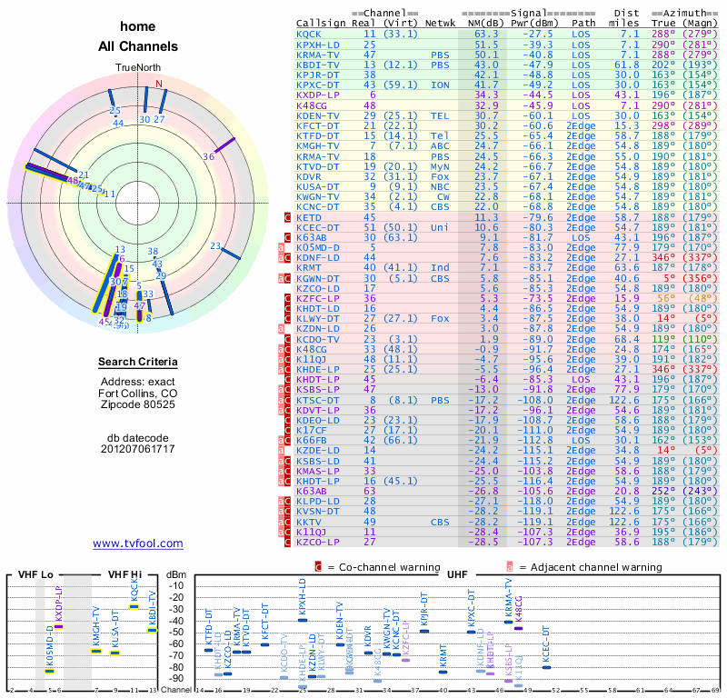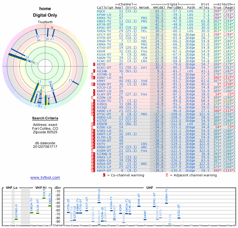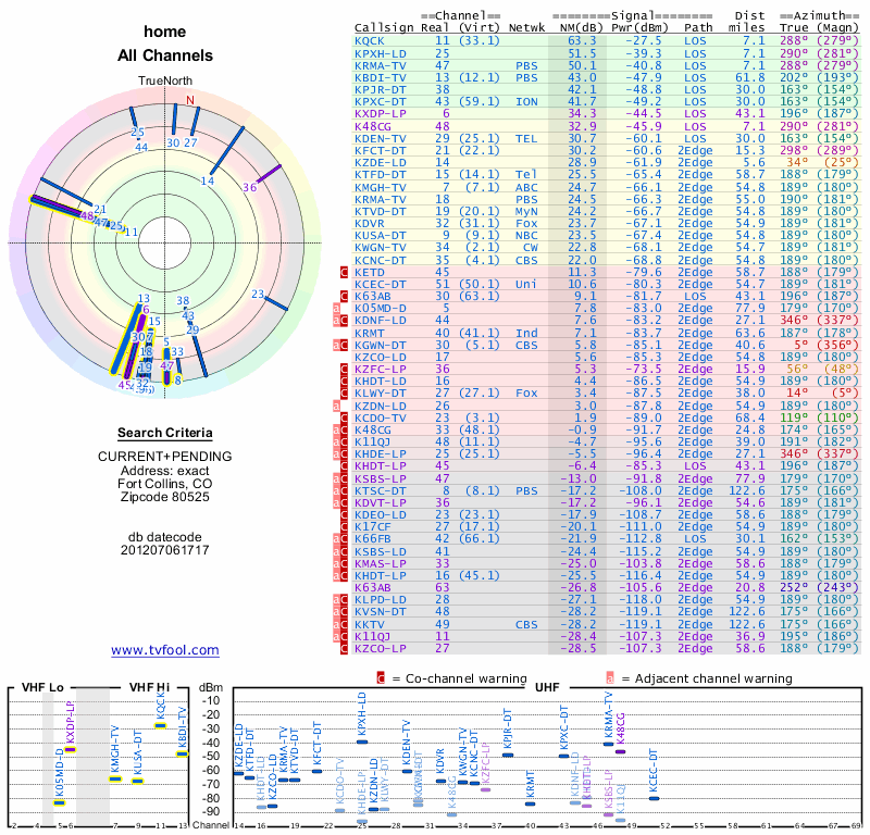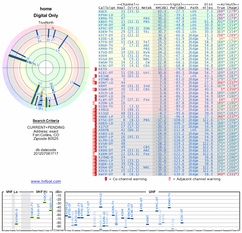 Here are the results for your location. The transmitter database was last updated on June 7, 2013. For more information about these plots and how to interpret them, please check out the Signal Analysis FAQ.