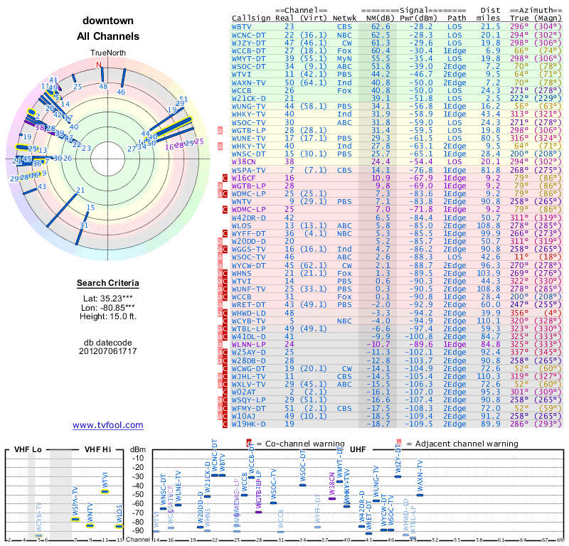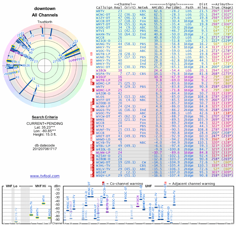 Here are the results for your location. The transmitter database was last updated on June 7, 2013. For more information about these plots and how to interpret them, please check out the Signal Analysis FAQ.
