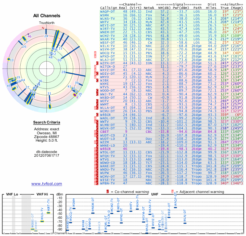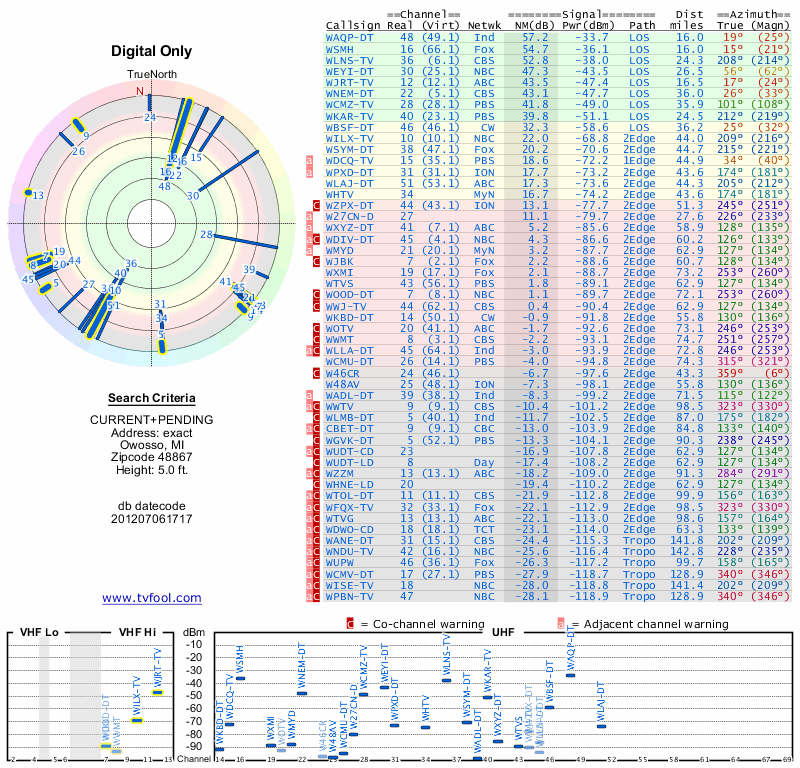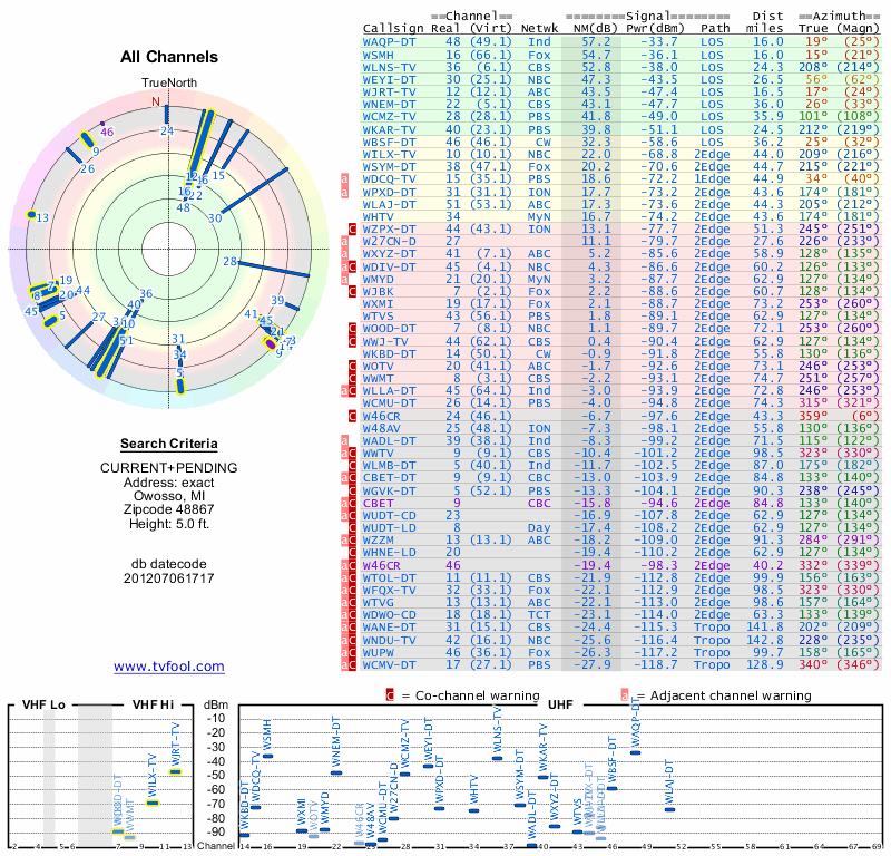 Here are the results for your location. The transmitter database was last updated on June 7, 2013. For more information about these plots and how to interpret them, please check out the Signal Analysis FAQ.