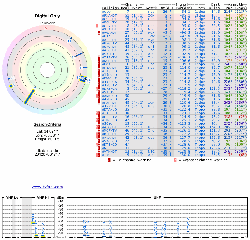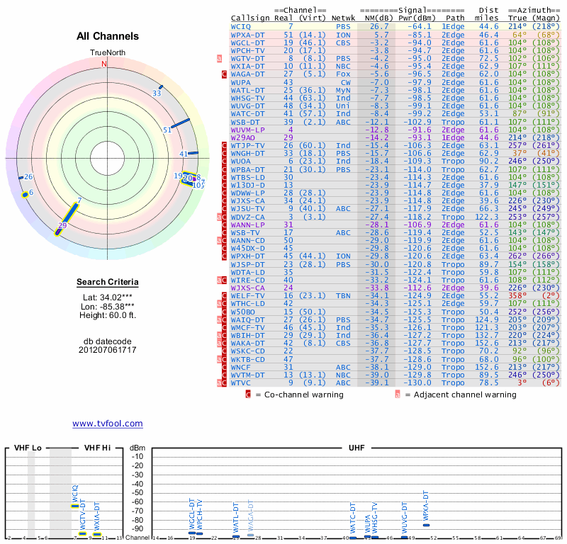 Here are the results for your location. The transmitter database was last updated on June 7, 2013. For more information about these plots and how to interpret them, please check out the Signal Analysis FAQ.