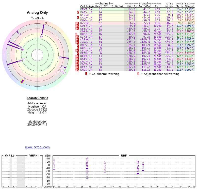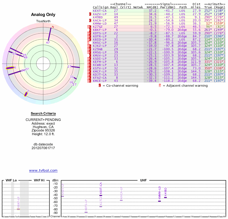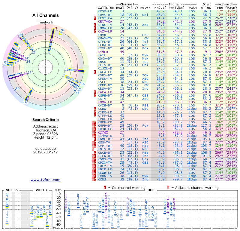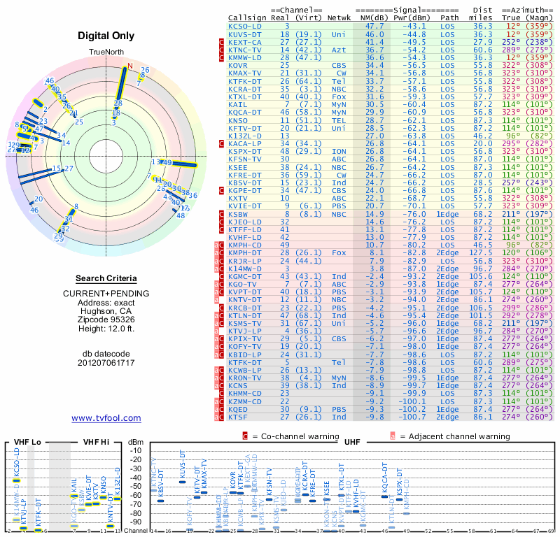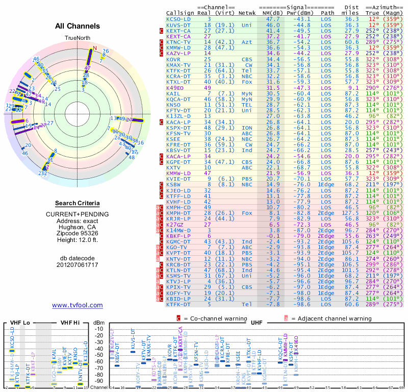 Here are the results for your location. The transmitter database was last updated on June 7, 2013. For more information about these plots and how to interpret them, please check out the Signal Analysis FAQ.
