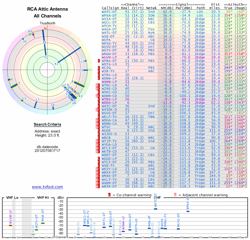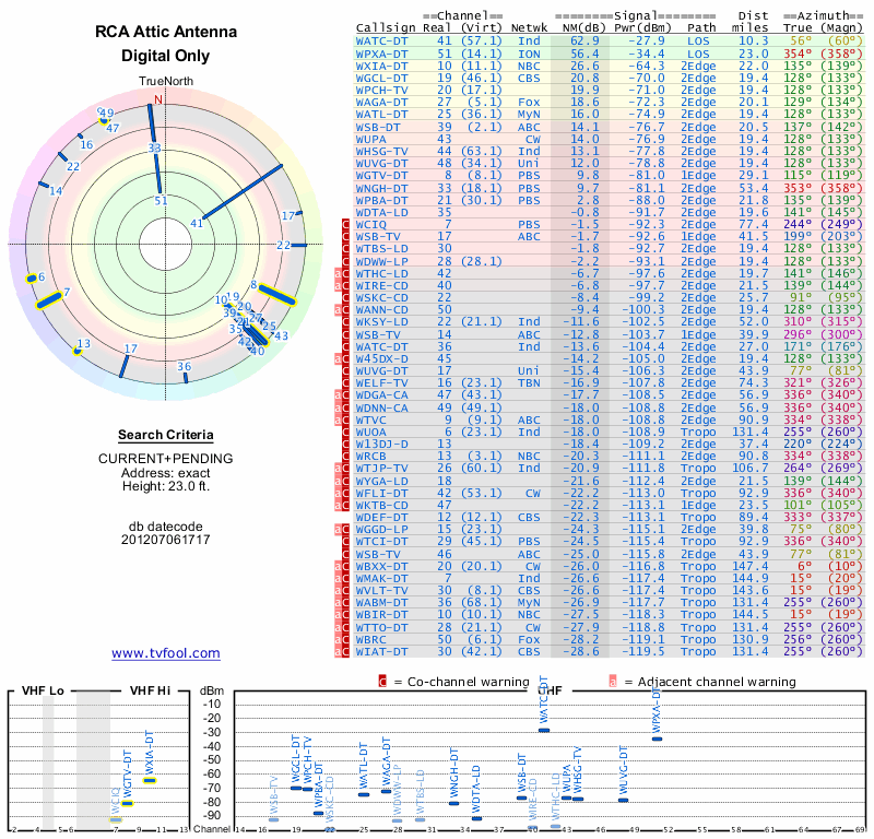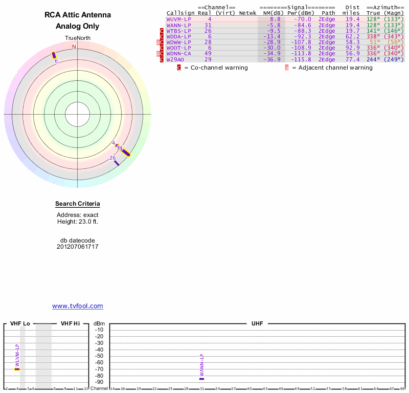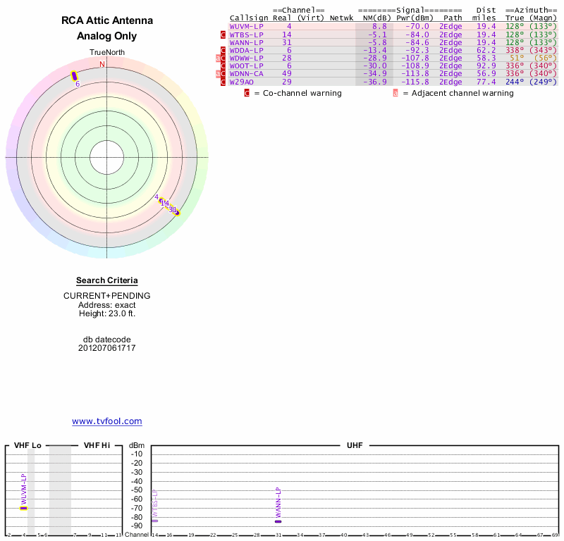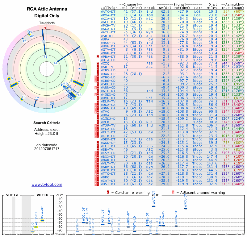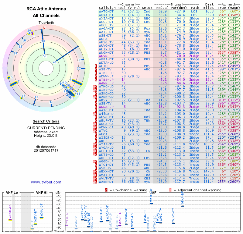 Here are the results for your location. The transmitter database was last updated on June 7, 2013. For more information about these plots and how to interpret them, please check out the Signal Analysis FAQ.