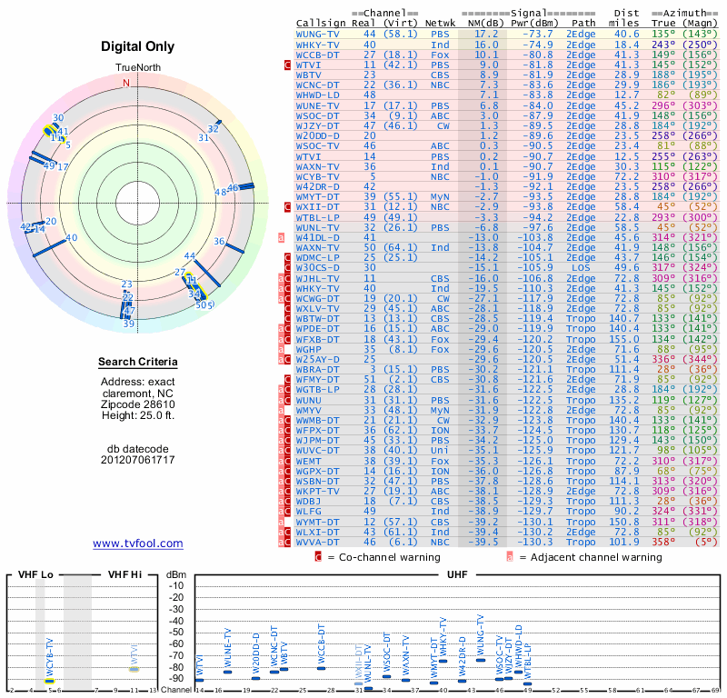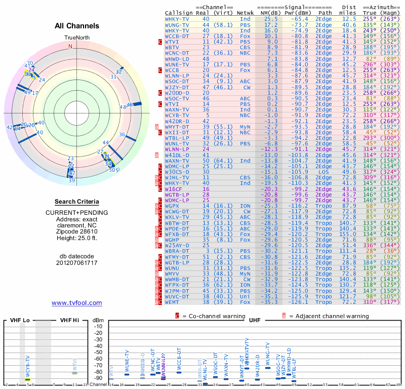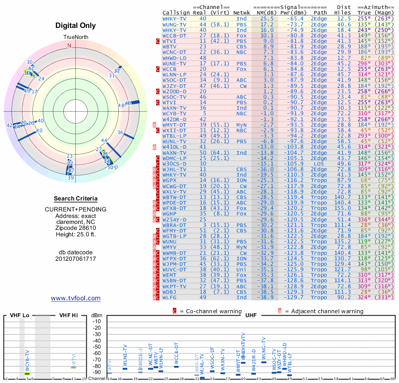 Here are the results for your location. The transmitter database was last updated on June 7, 2013. For more information about these plots and how to interpret them, please check out the Signal Analysis FAQ.