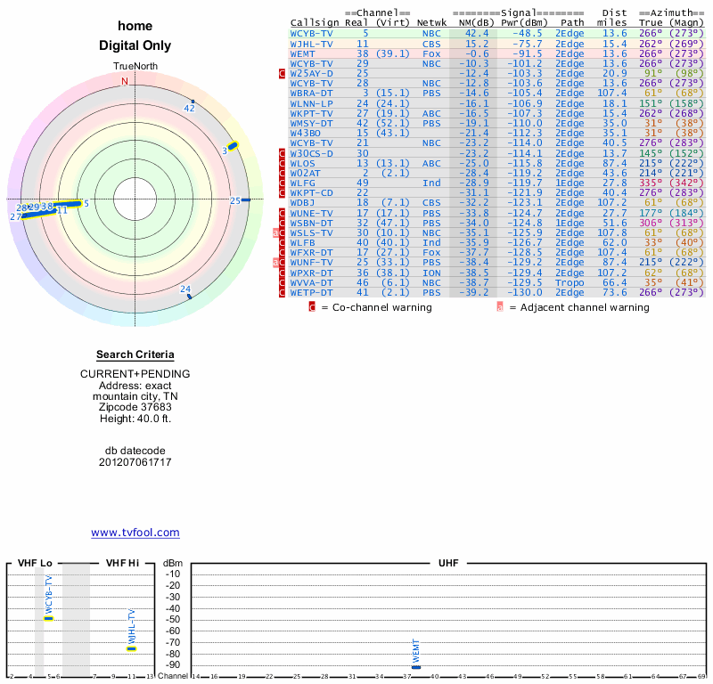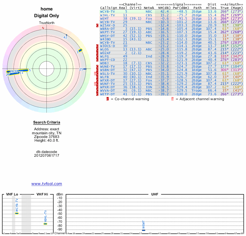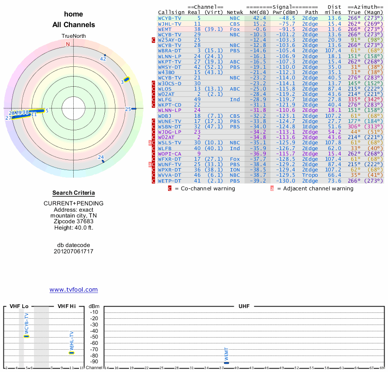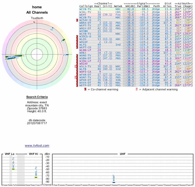 Here are the results for your location. The transmitter database was last updated on June 7, 2013. For more information about these plots and how to interpret them, please check out the Signal Analysis FAQ.