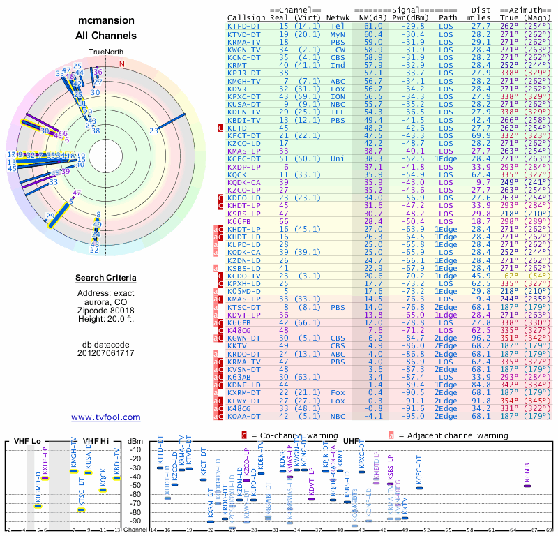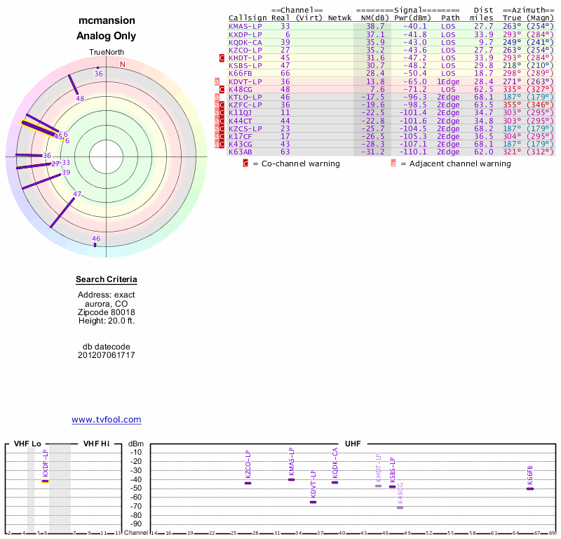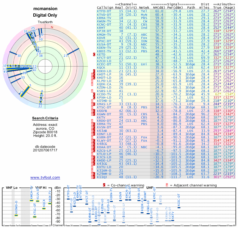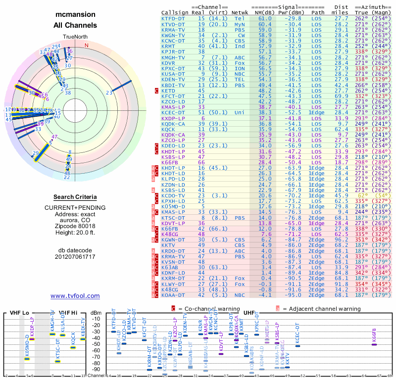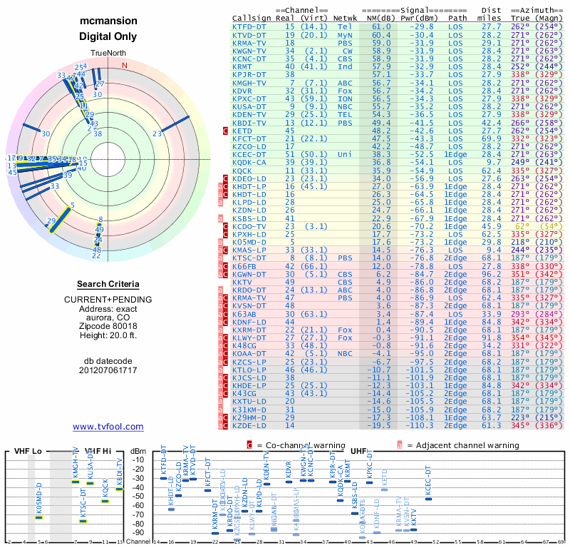 Here are the results for your location. The transmitter database was last updated on June 7, 2013. For more information about these plots and how to interpret them, please check out the Signal Analysis FAQ.