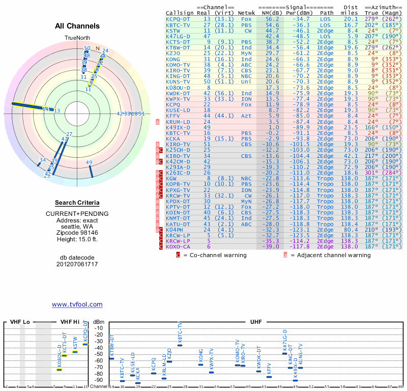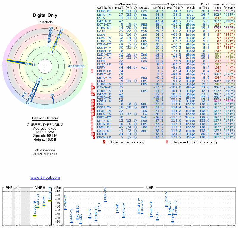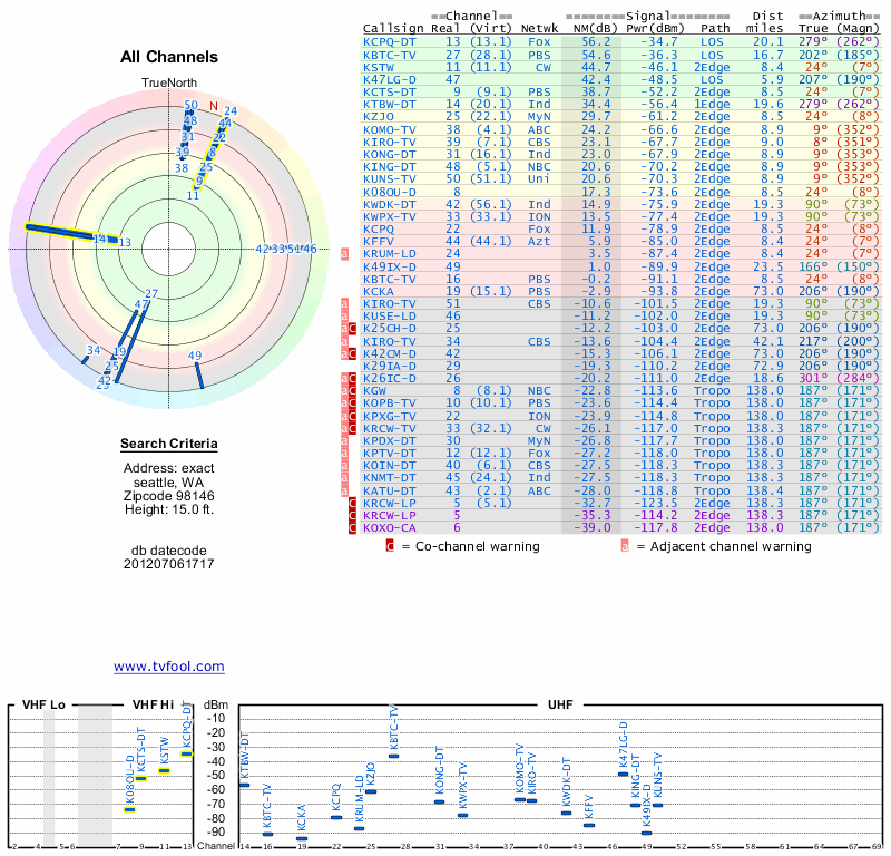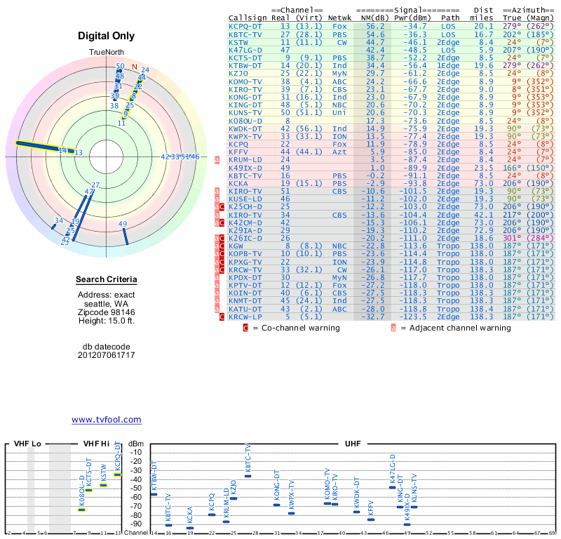 Here are the results for your location. The transmitter database was last updated on June 7, 2013. For more information about these plots and how to interpret them, please check out the Signal Analysis FAQ.