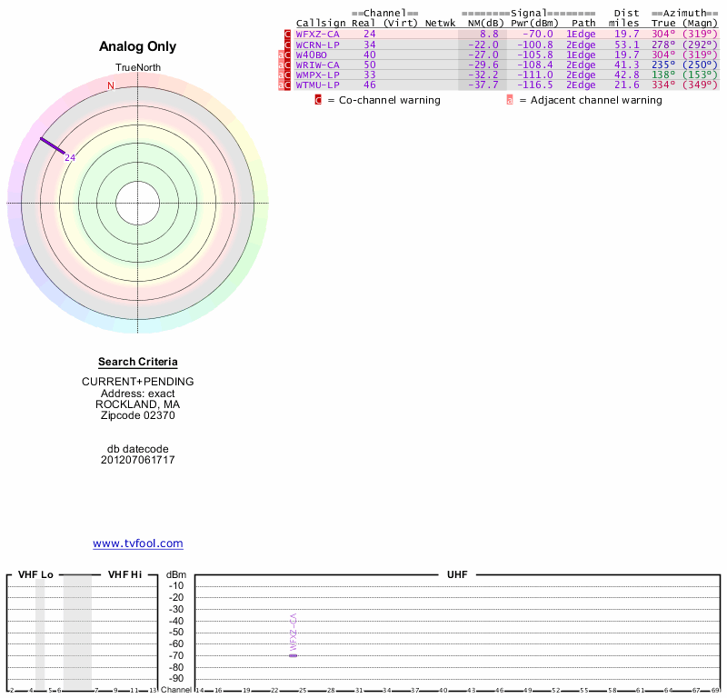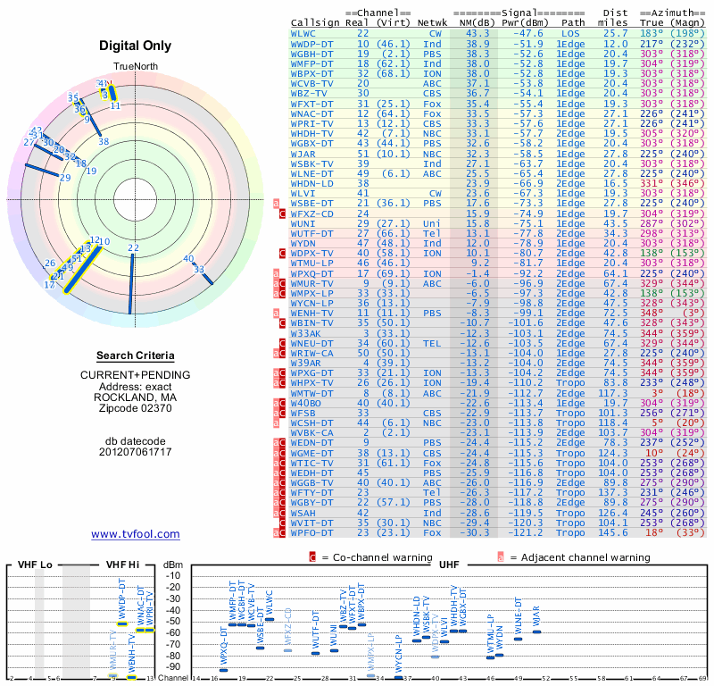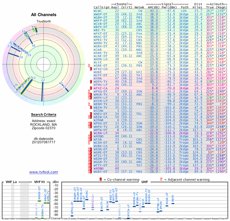 Here are the results for your location. The transmitter database was last updated on June 7, 2013. For more information about these plots and how to interpret them, please check out the Signal Analysis FAQ.