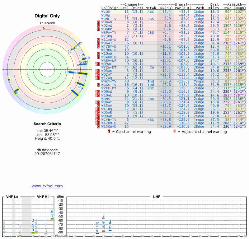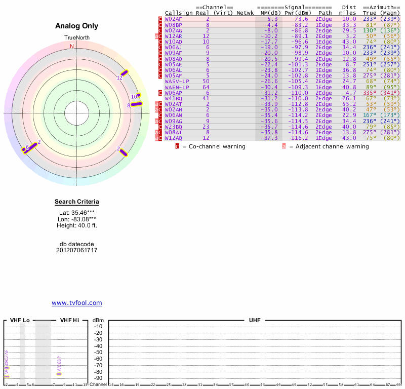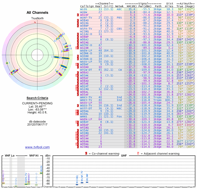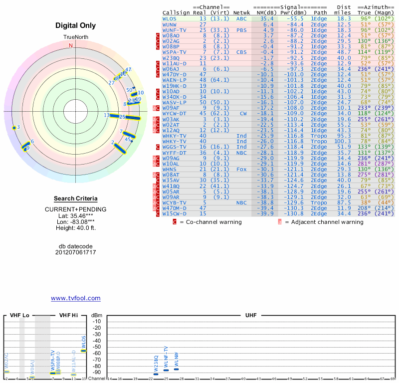 Here are the results for your location. The transmitter database was last updated on June 7, 2013. For more information about these plots and how to interpret them, please check out the Signal Analysis FAQ.