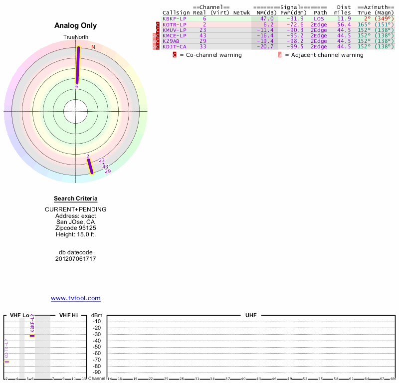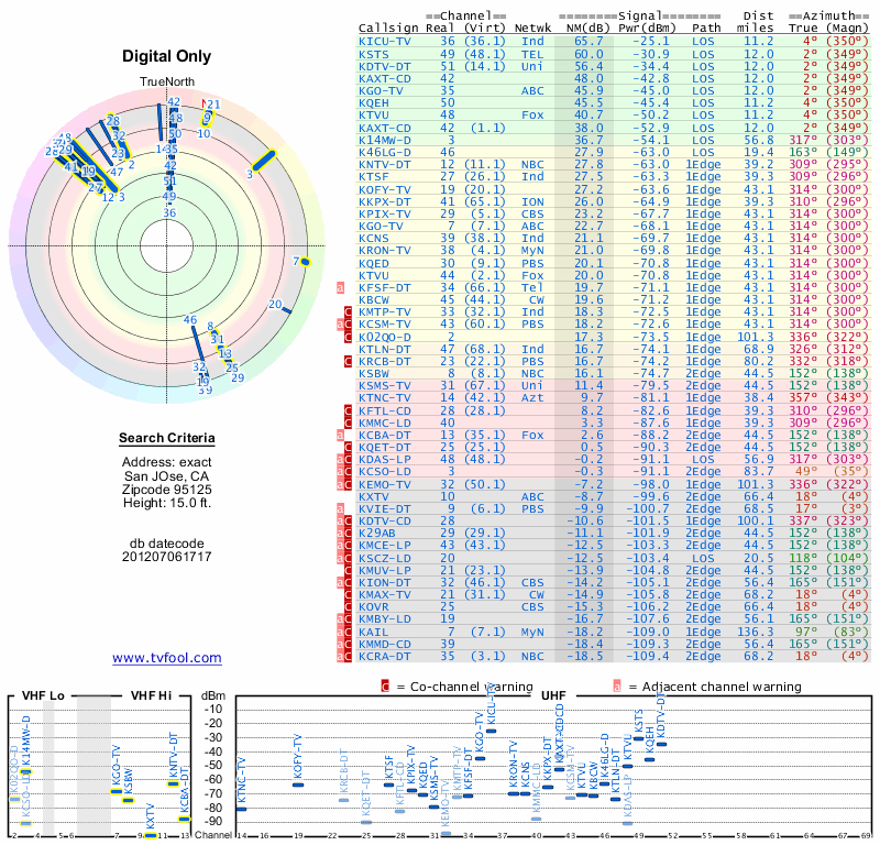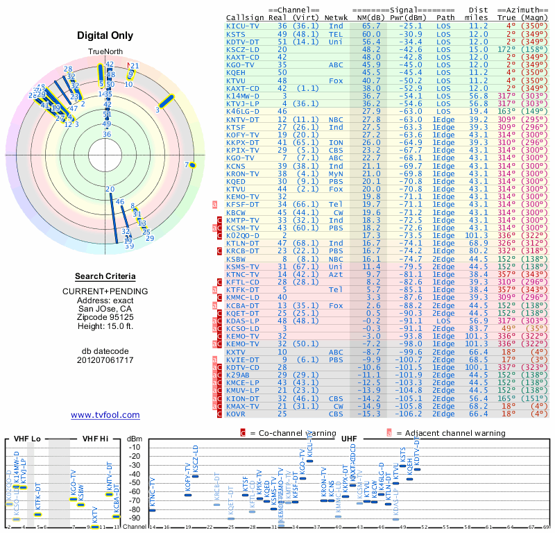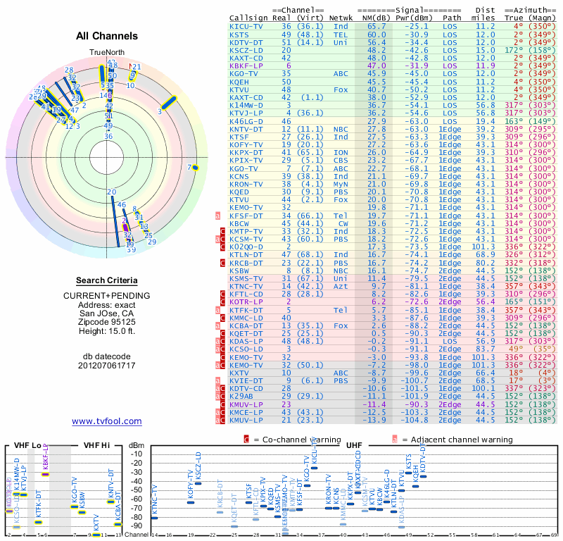 Here are the results for your location. The transmitter database was last updated on June 7, 2013. For more information about these plots and how to interpret them, please check out the Signal Analysis FAQ.
