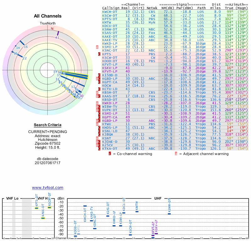 Here are the results for your location. The transmitter database was last updated on June 7, 2013. For more information about these plots and how to interpret them, please check out the Signal Analysis FAQ.