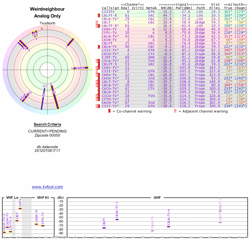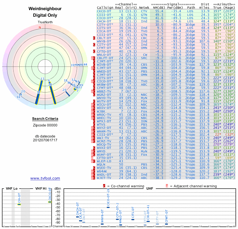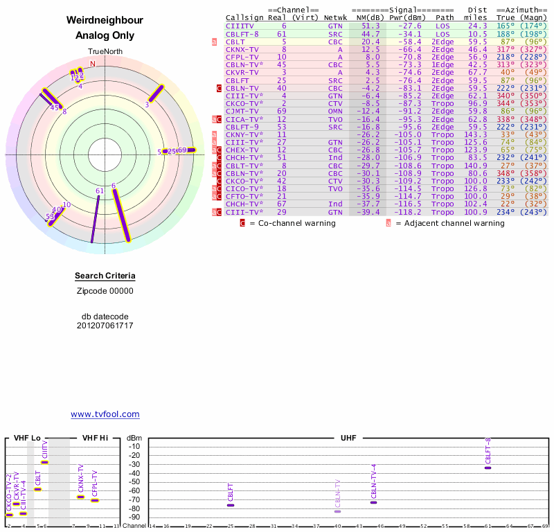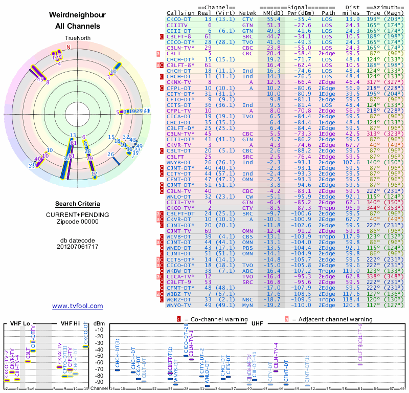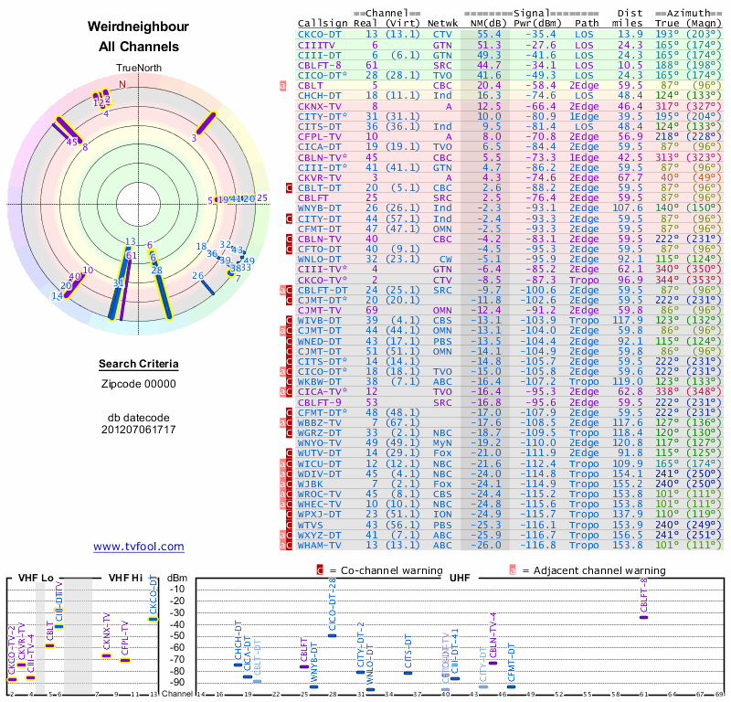 Here are the results for your location. The transmitter database was last updated on June 7, 2013. For more information about these plots and how to interpret them, please check out the Signal Analysis FAQ.
