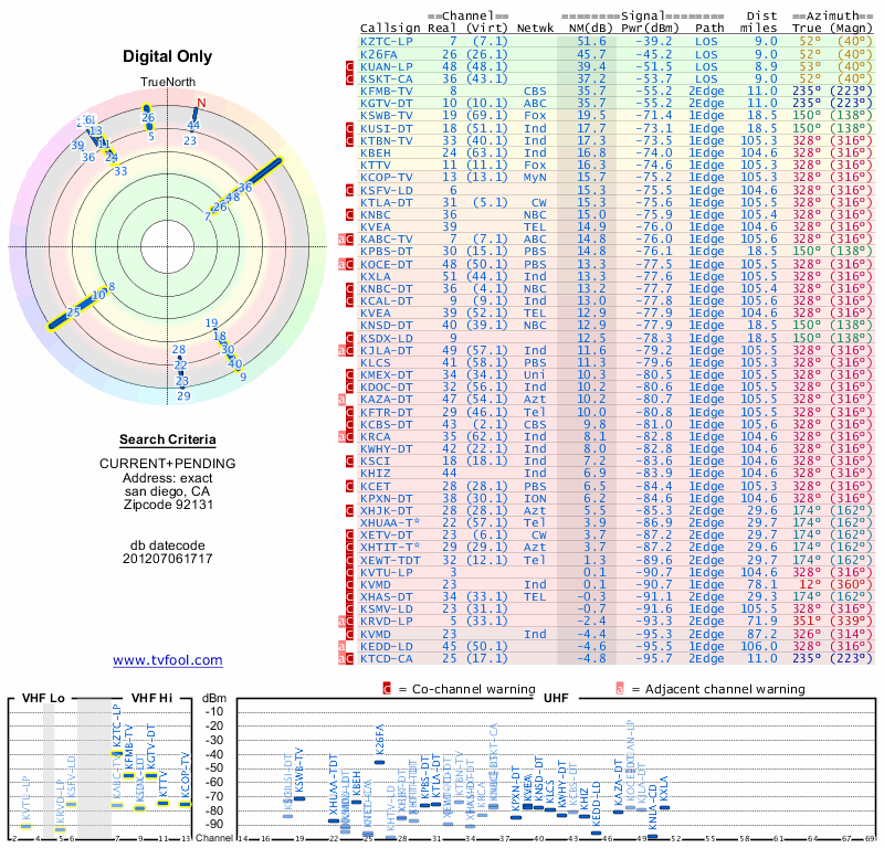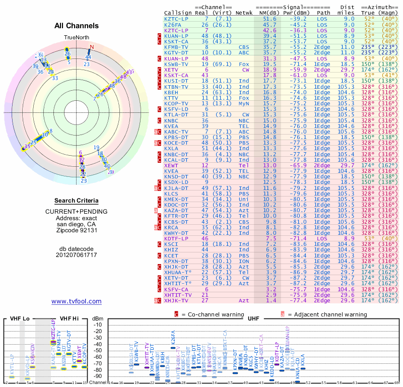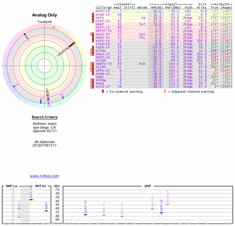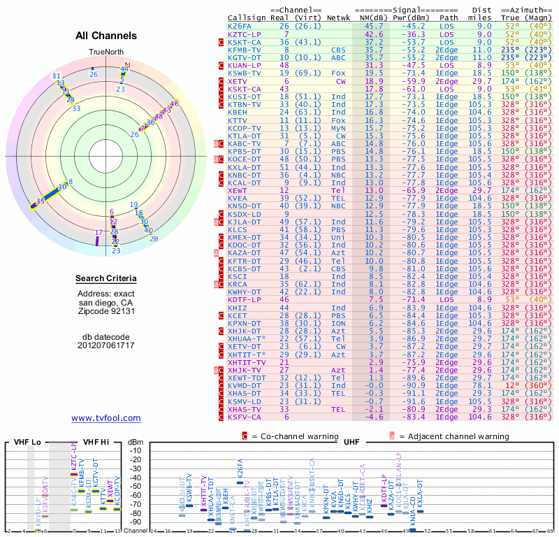 Here are the results for your location. The transmitter database was last updated on June 7, 2013. For more information about these plots and how to interpret them, please check out the Signal Analysis FAQ.