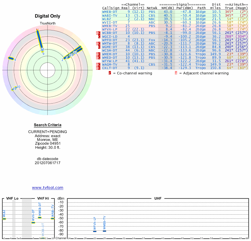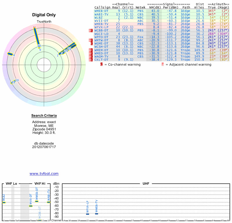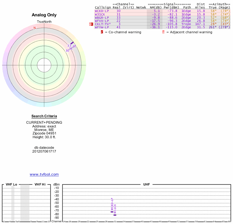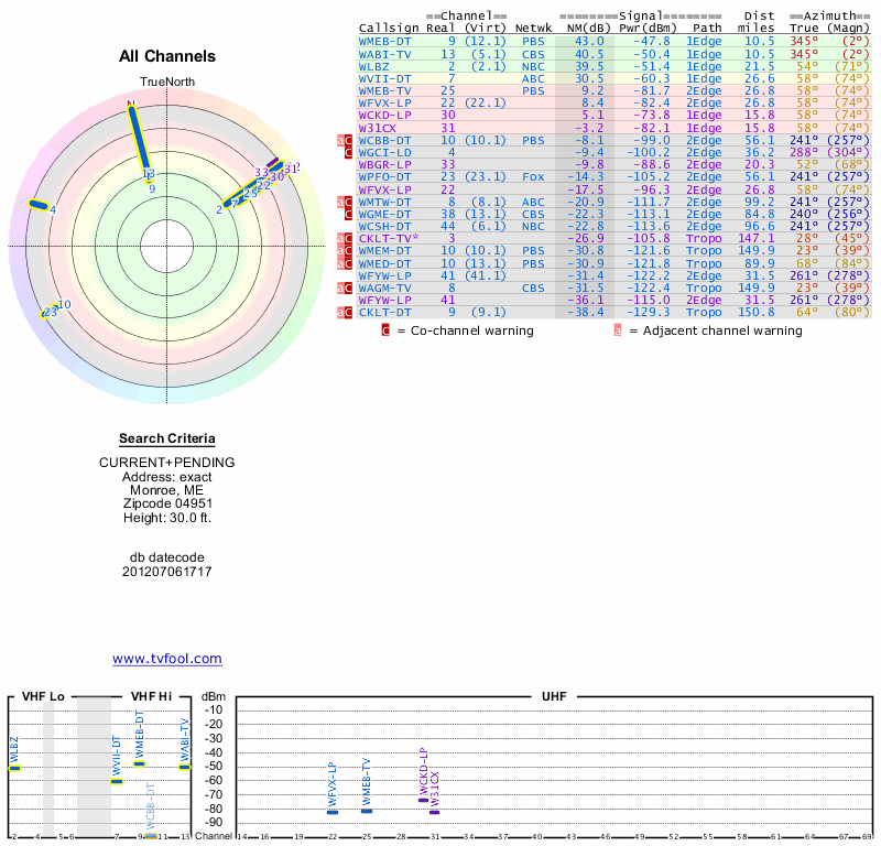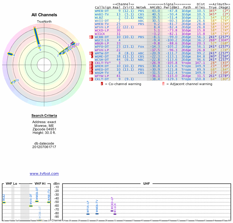 Here are the results for your location. The transmitter database was last updated on June 7, 2013. For more information about these plots and how to interpret them, please check out the Signal Analysis FAQ.