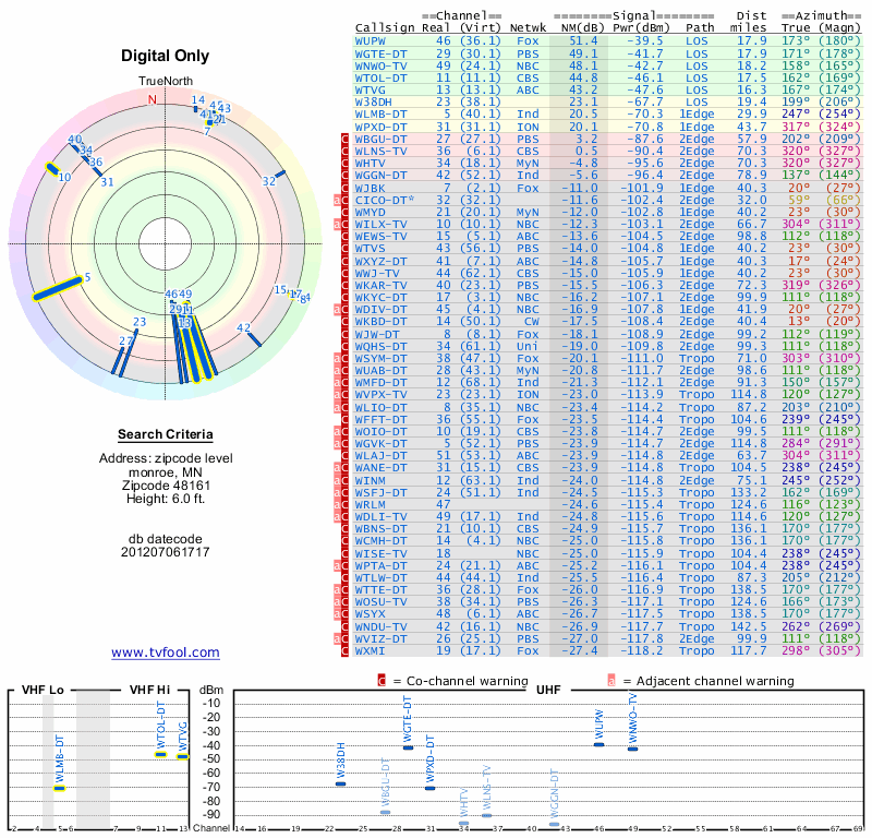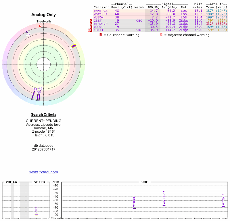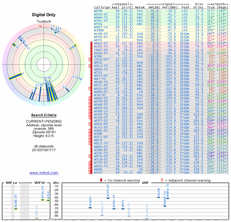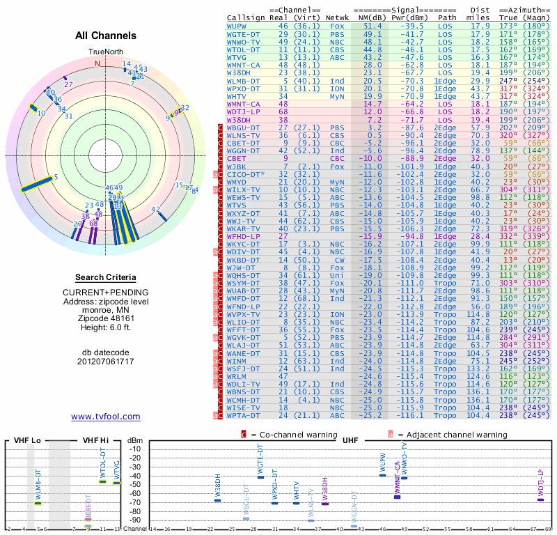 Here are the results for your location. The transmitter database was last updated on June 7, 2013. For more information about these plots and how to interpret them, please check out the Signal Analysis FAQ.