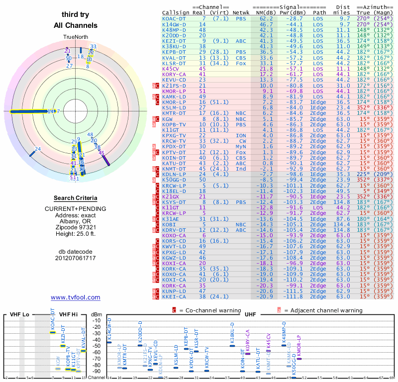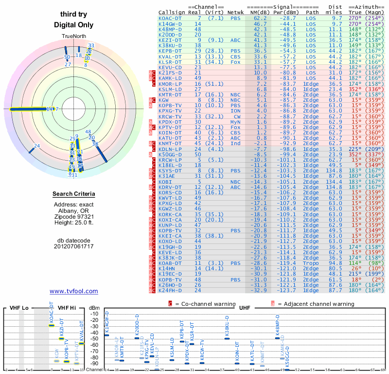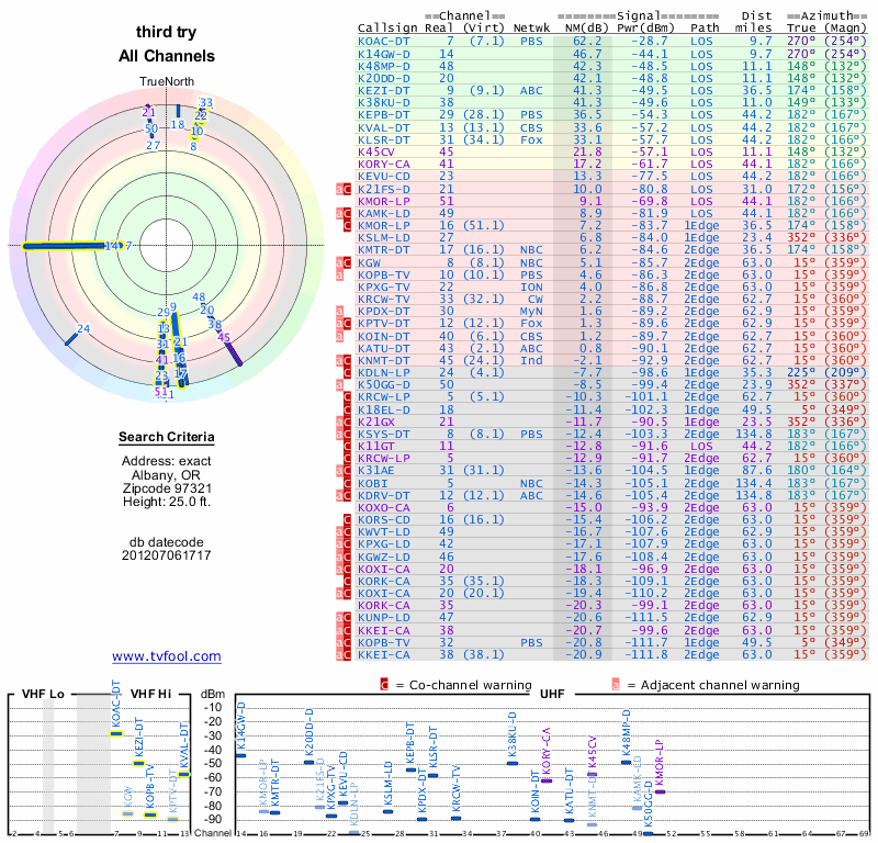 Here are the results for your location. The transmitter database was last updated on June 7, 2013. For more information about these plots and how to interpret them, please check out the Signal Analysis FAQ.