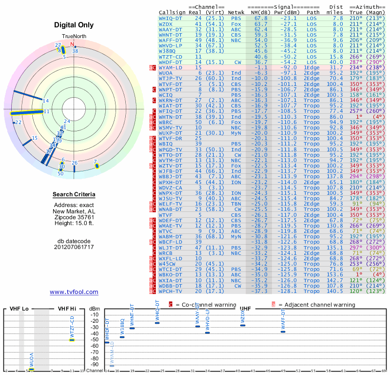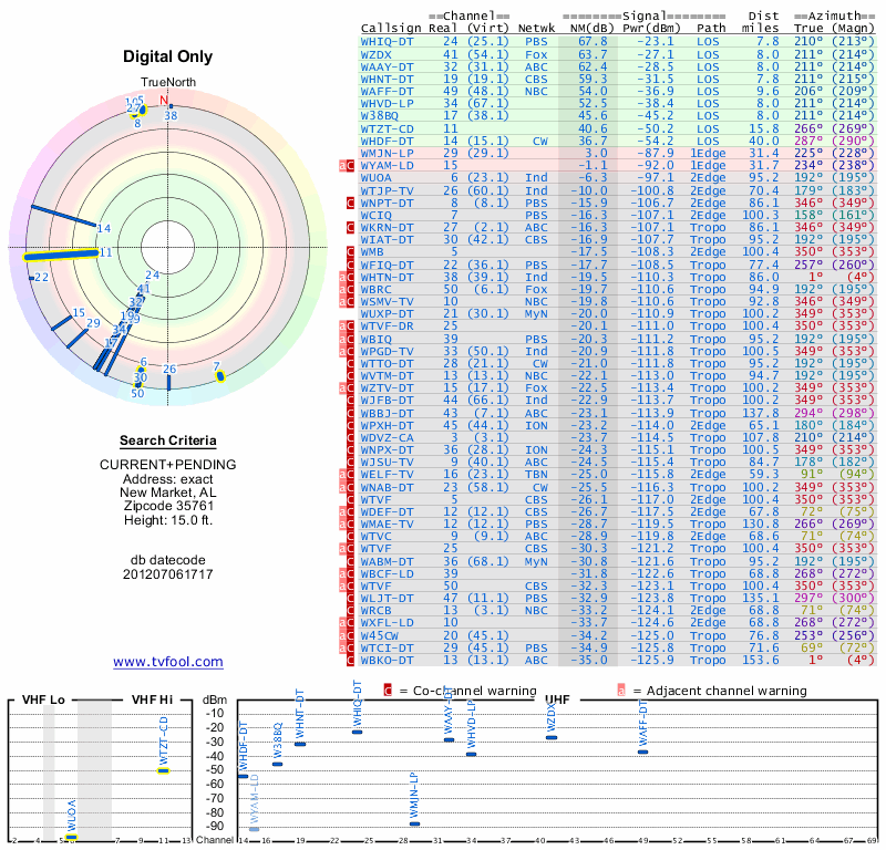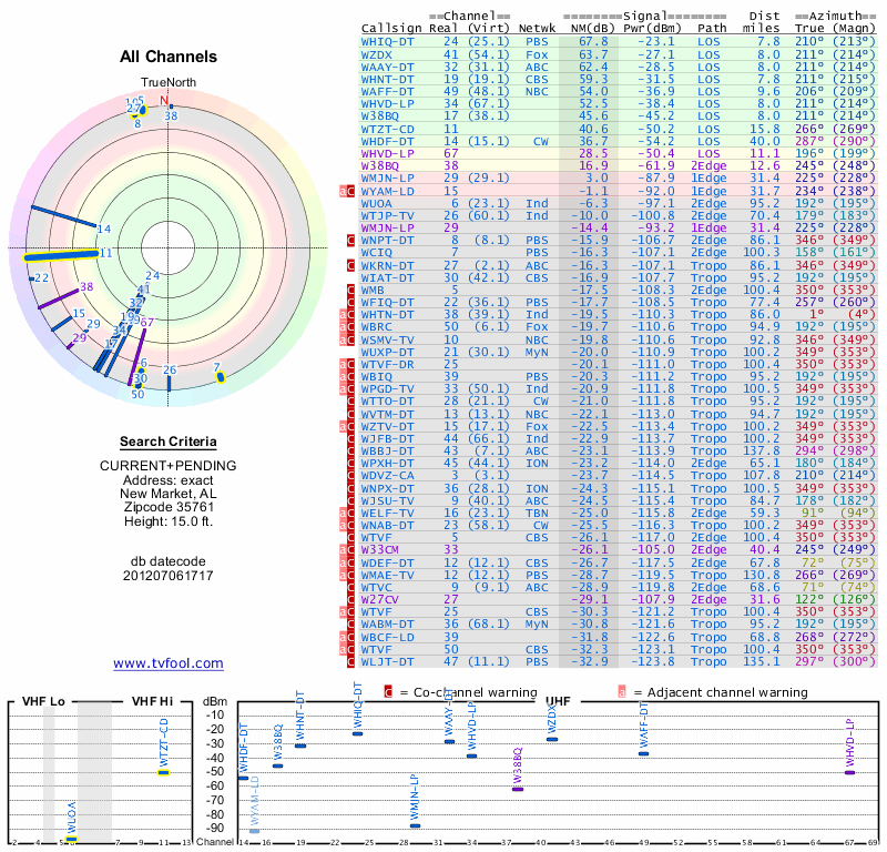 Here are the results for your location. The transmitter database was last updated on June 7, 2013. For more information about these plots and how to interpret them, please check out the Signal Analysis FAQ.