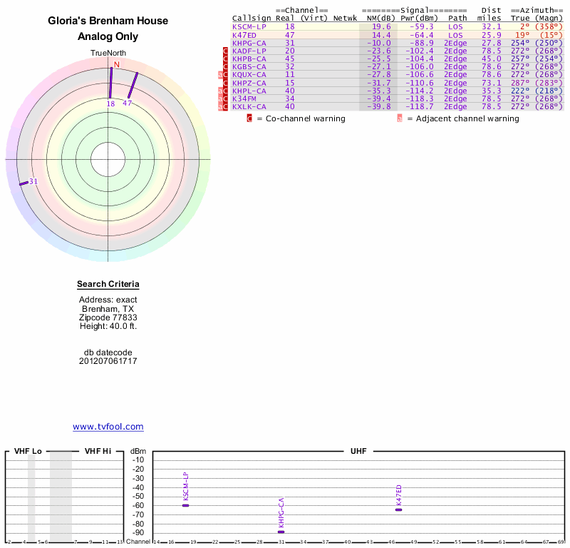 Here are the results for your location. The transmitter database was last updated on June 7, 2013. For more information about these plots and how to interpret them, please check out the Signal Analysis FAQ.