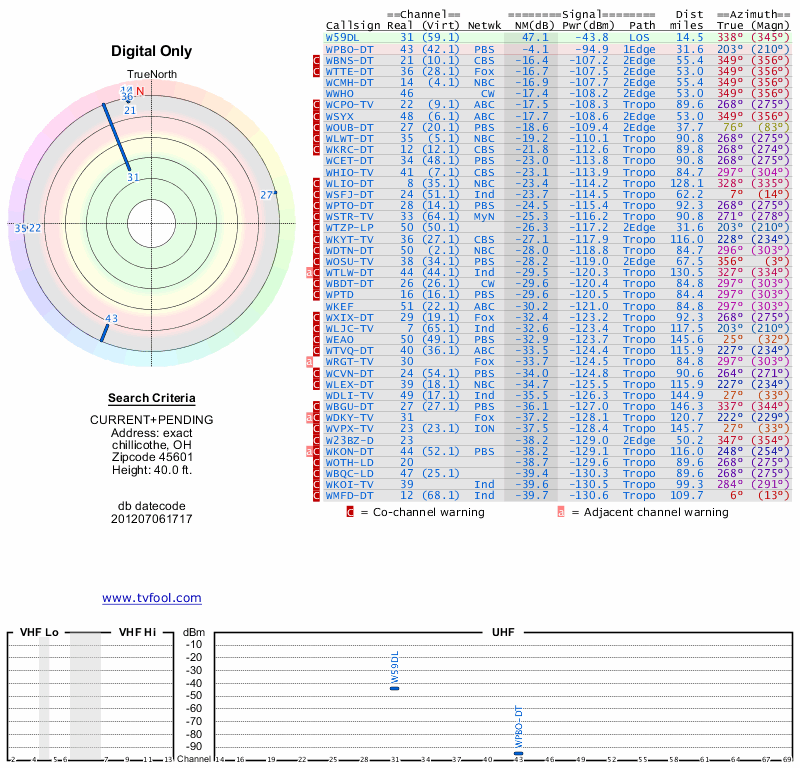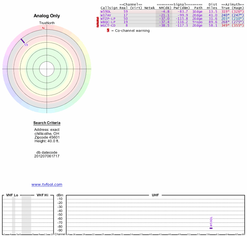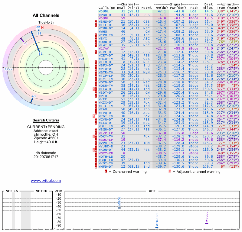 Here are the results for your location. The transmitter database was last updated on June 7, 2013. For more information about these plots and how to interpret them, please check out the Signal Analysis FAQ.