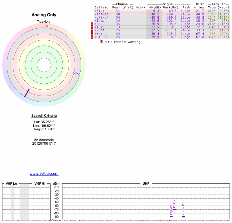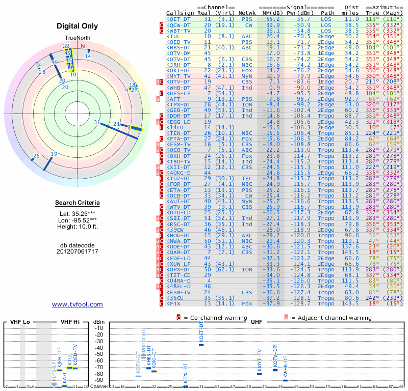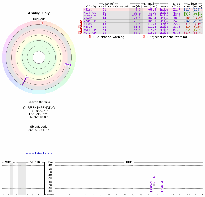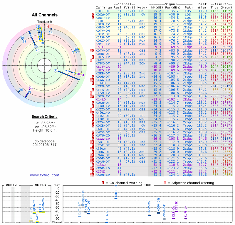 Here are the results for your location. The transmitter database was last updated on June 7, 2013. For more information about these plots and how to interpret them, please check out the Signal Analysis FAQ.