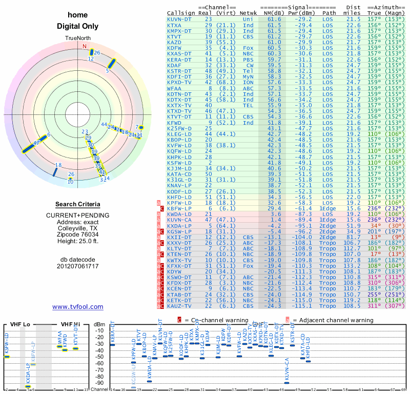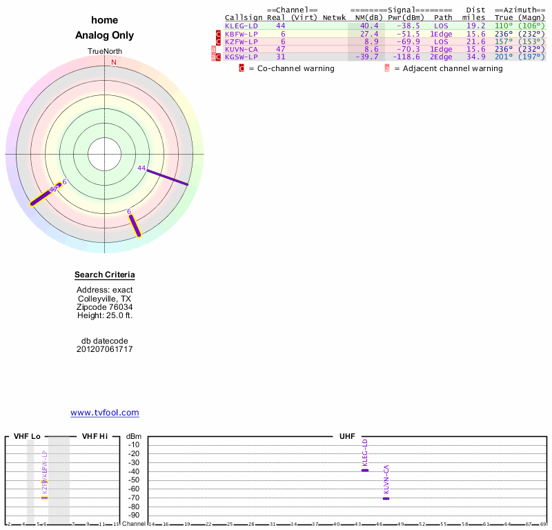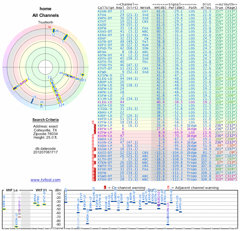 Here are the results for your location. The transmitter database was last updated on June 7, 2013. For more information about these plots and how to interpret them, please check out the Signal Analysis FAQ.
