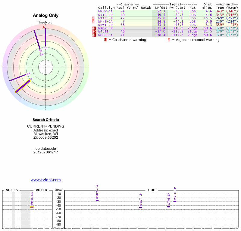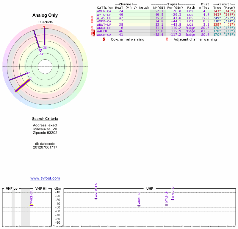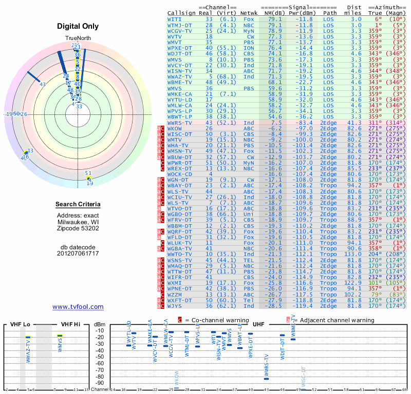 Here are the results for your location. The transmitter database was last updated on June 7, 2013. For more information about these plots and how to interpret them, please check out the Signal Analysis FAQ.