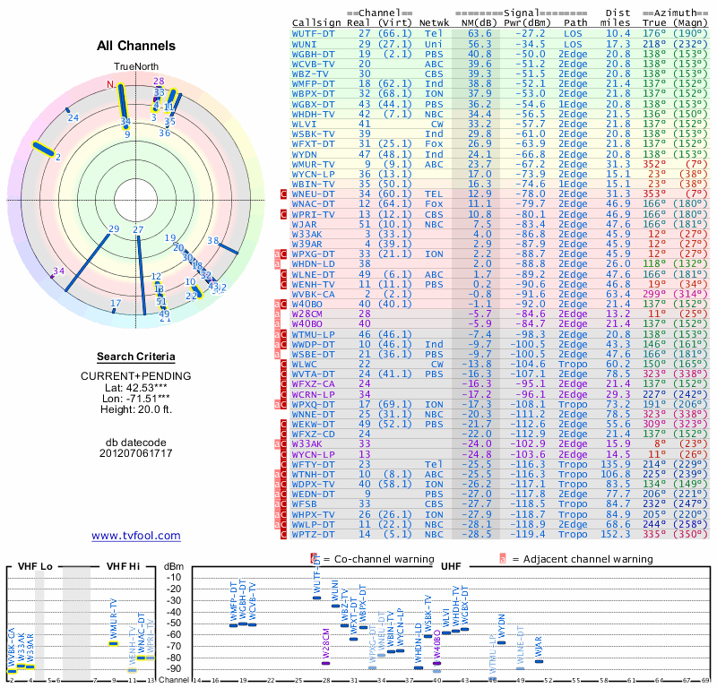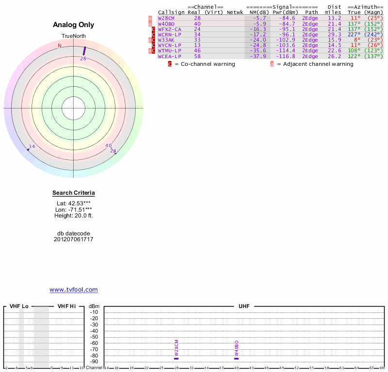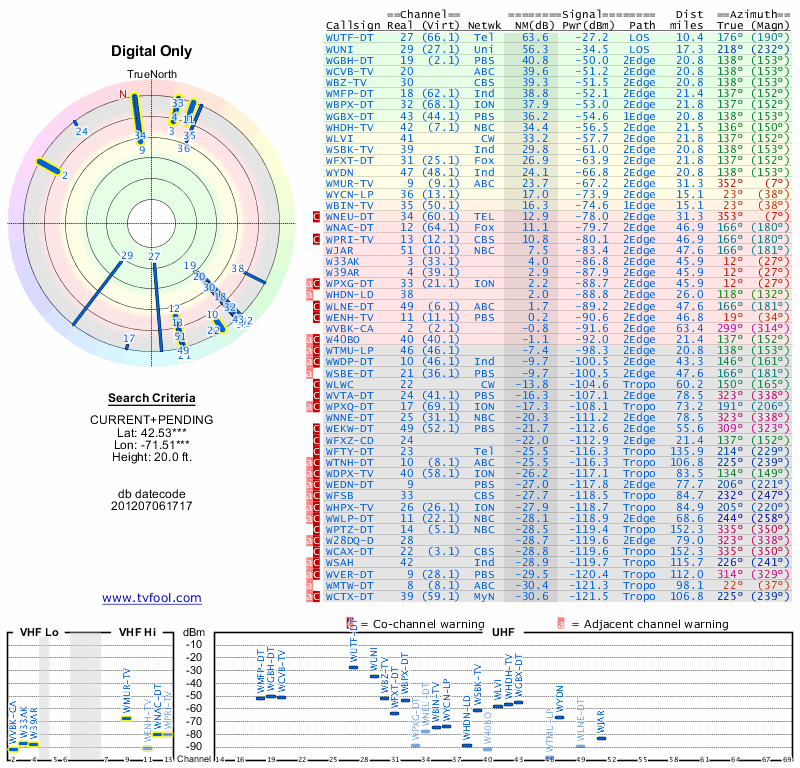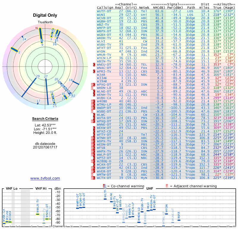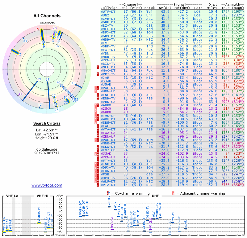 Here are the results for your location. The transmitter database was last updated on June 7, 2013. For more information about these plots and how to interpret them, please check out the Signal Analysis FAQ.