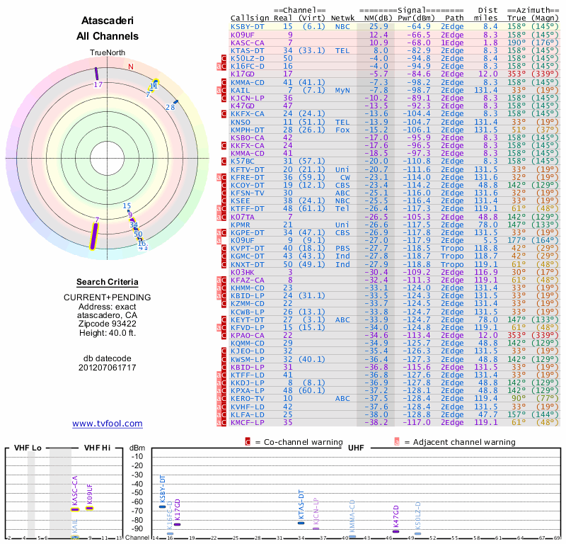 Here are the results for your location. The transmitter database was last updated on June 7, 2013. For more information about these plots and how to interpret them, please check out the Signal Analysis FAQ.