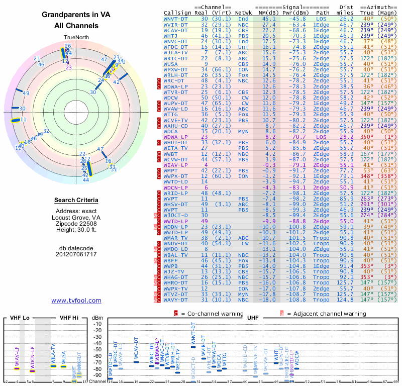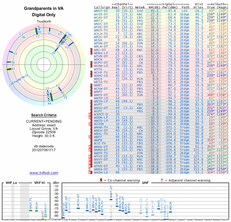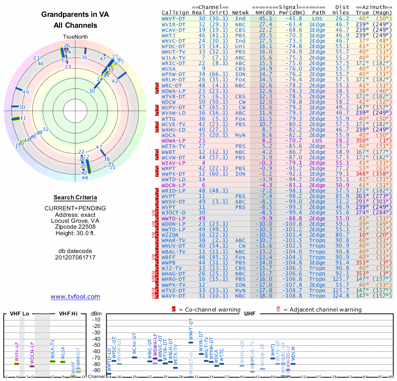 Here are the results for your location. The transmitter database was last updated on June 7, 2013. For more information about these plots and how to interpret them, please check out the Signal Analysis FAQ.