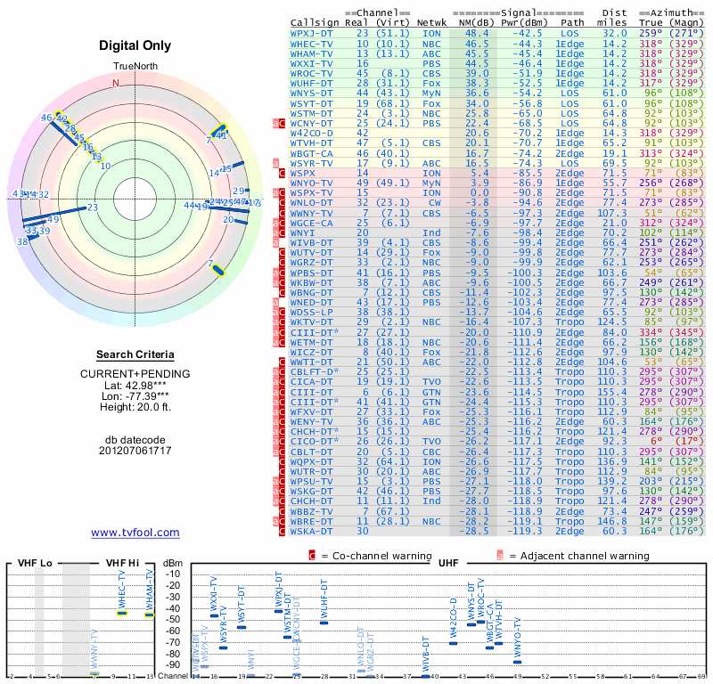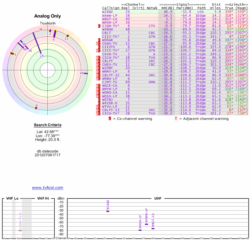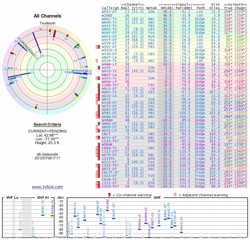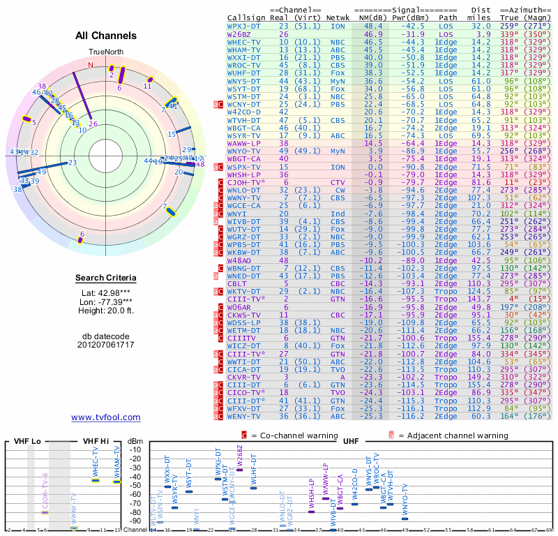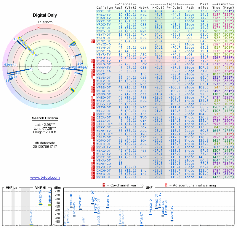 Here are the results for your location. The transmitter database was last updated on June 7, 2013. For more information about these plots and how to interpret them, please check out the Signal Analysis FAQ.