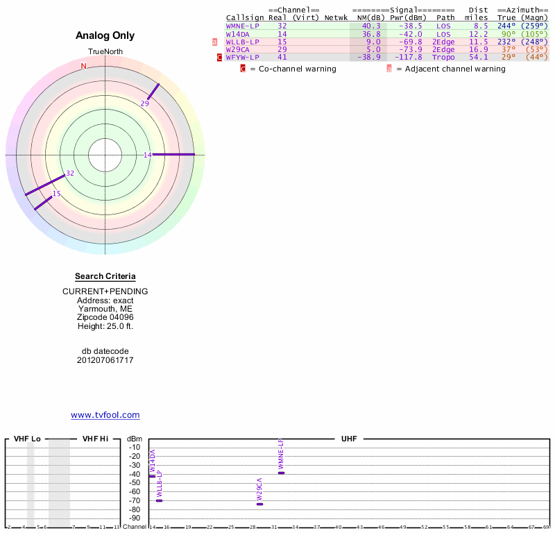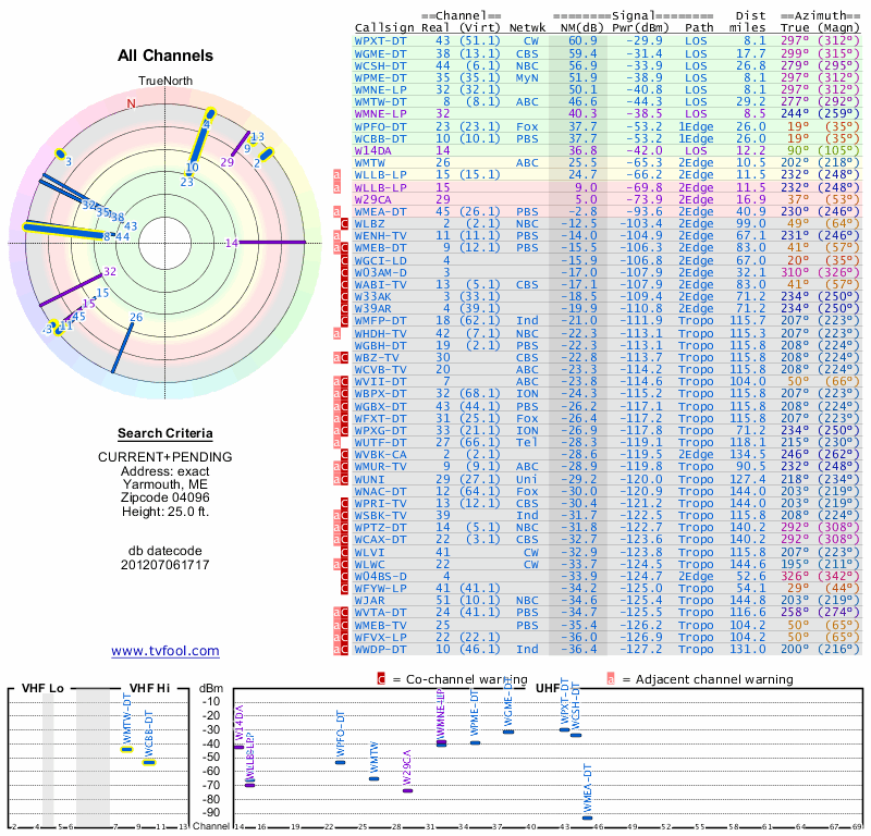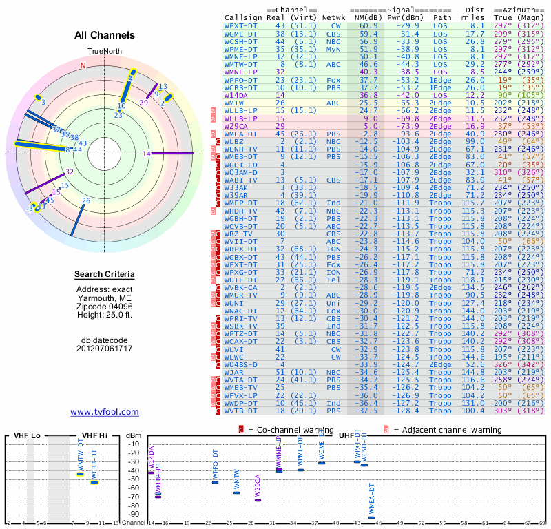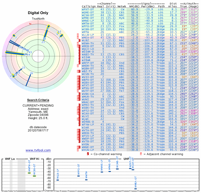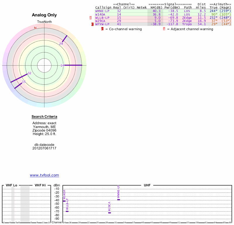 Here are the results for your location. The transmitter database was last updated on June 7, 2013. For more information about these plots and how to interpret them, please check out the Signal Analysis FAQ.