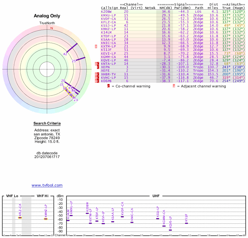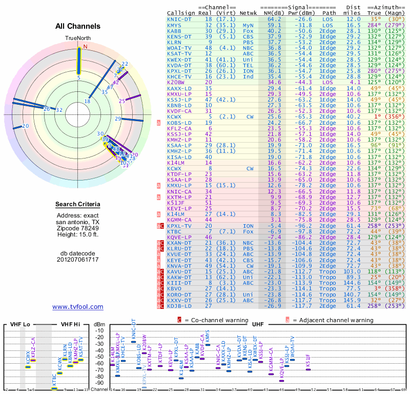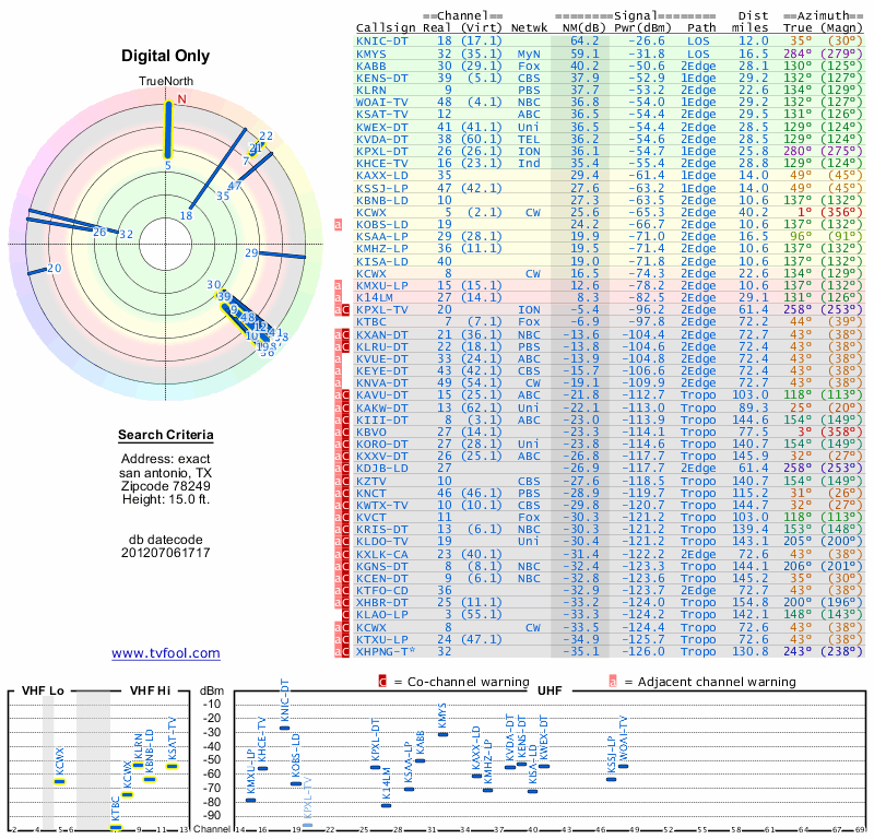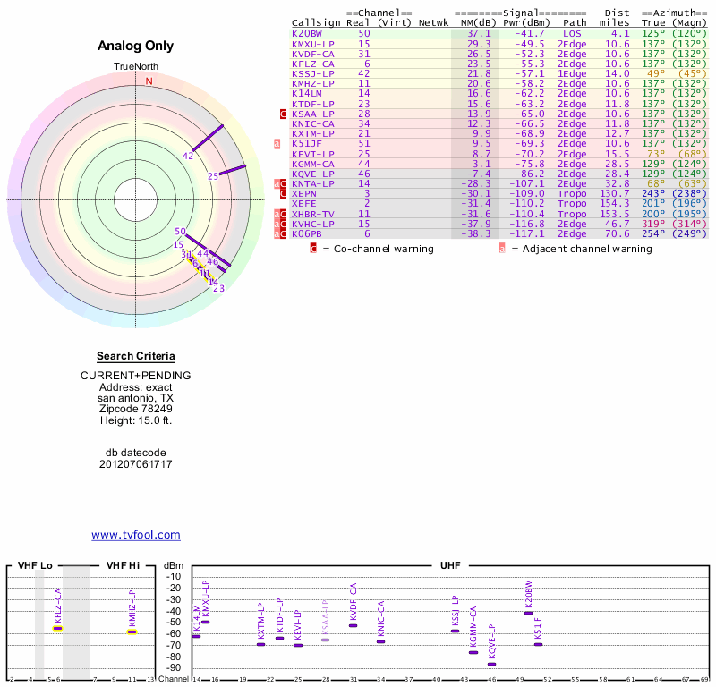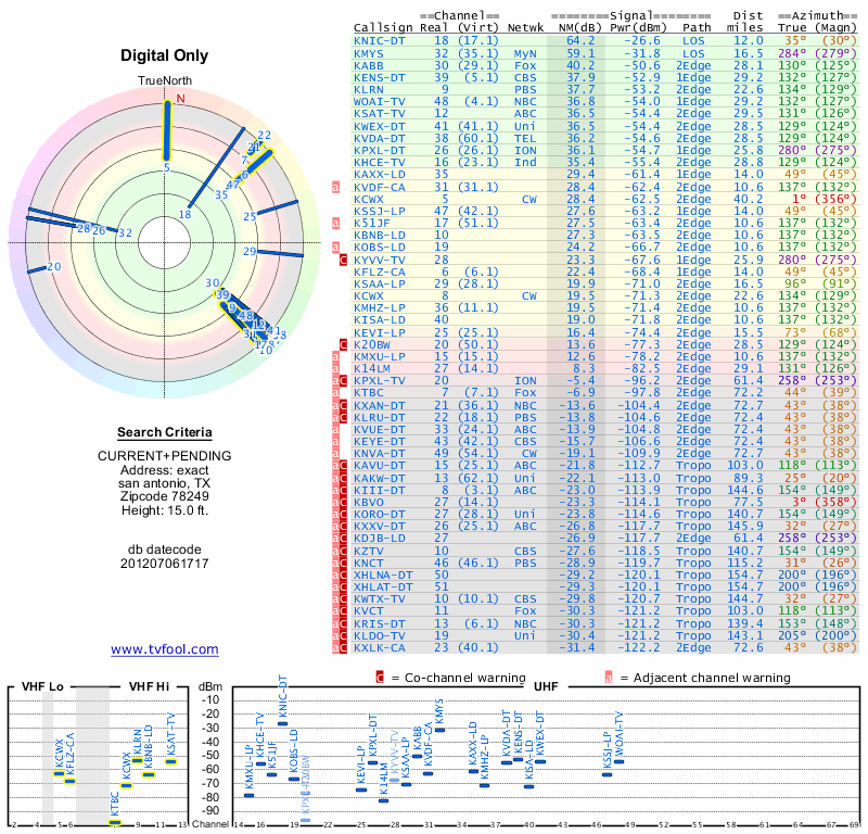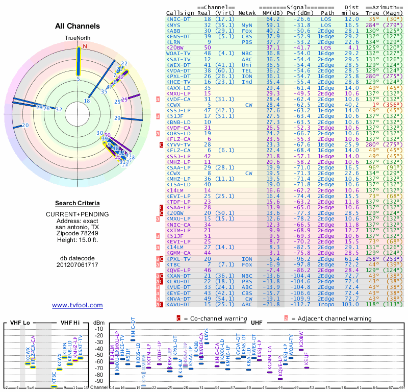 Here are the results for your location. The transmitter database was last updated on June 7, 2013. For more information about these plots and how to interpret them, please check out the Signal Analysis FAQ.