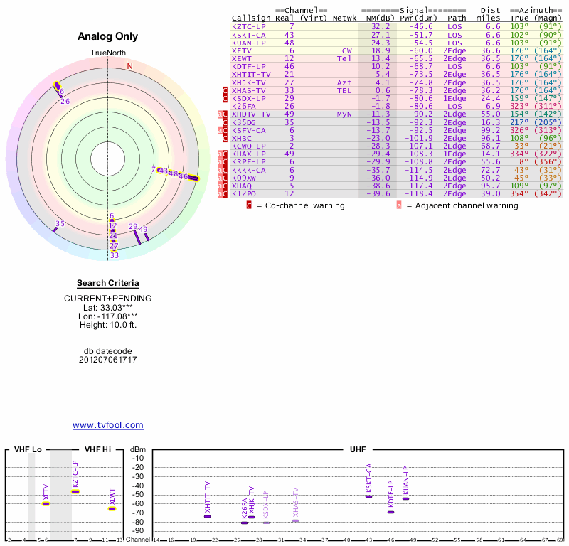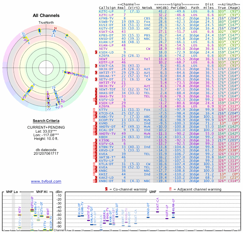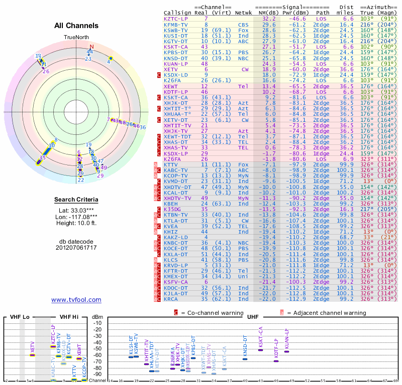 Here are the results for your location. The transmitter database was last updated on June 7, 2013. For more information about these plots and how to interpret them, please check out the Signal Analysis FAQ.