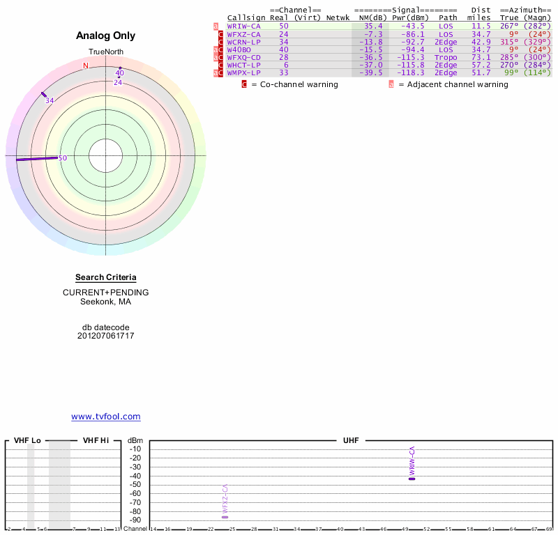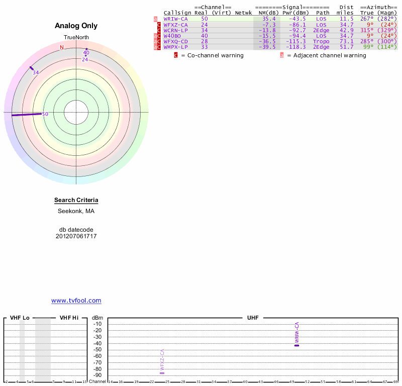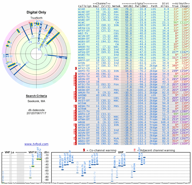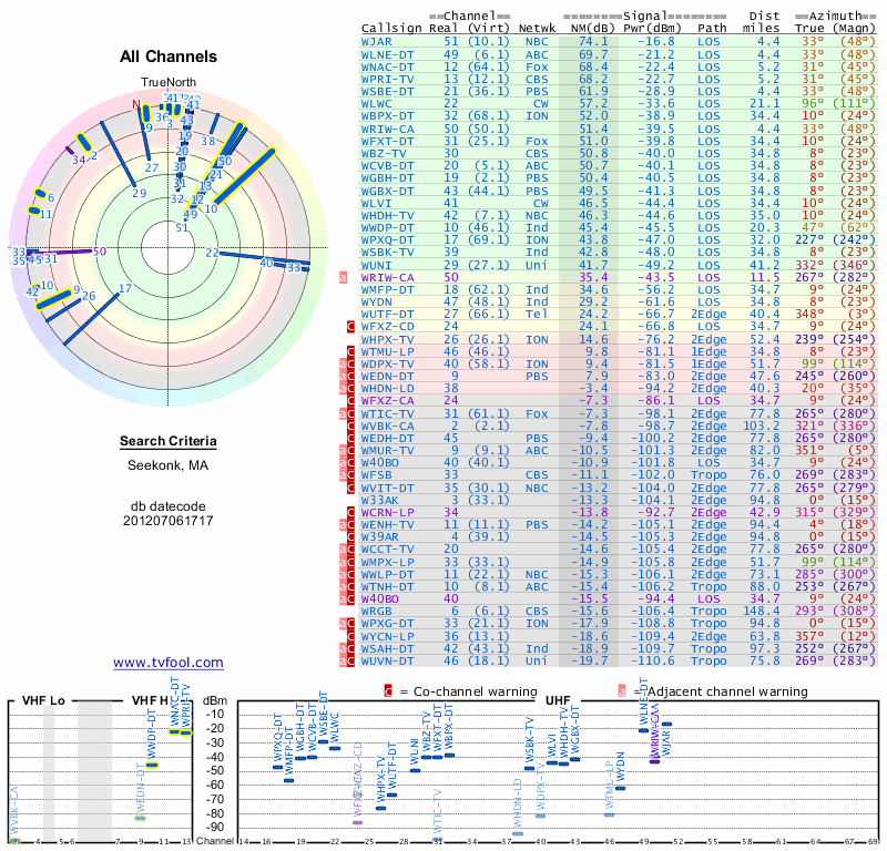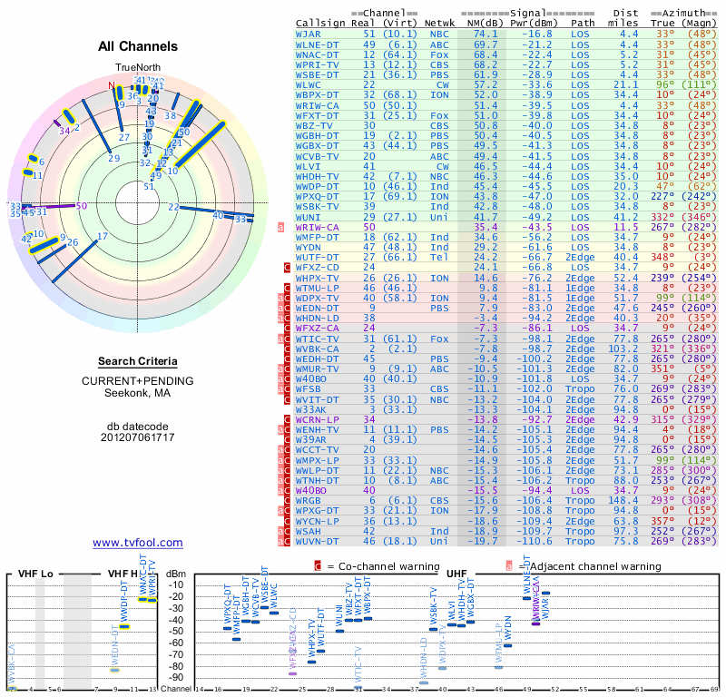 Here are the results for your location. The transmitter database was last updated on June 7, 2013. For more information about these plots and how to interpret them, please check out the Signal Analysis FAQ.