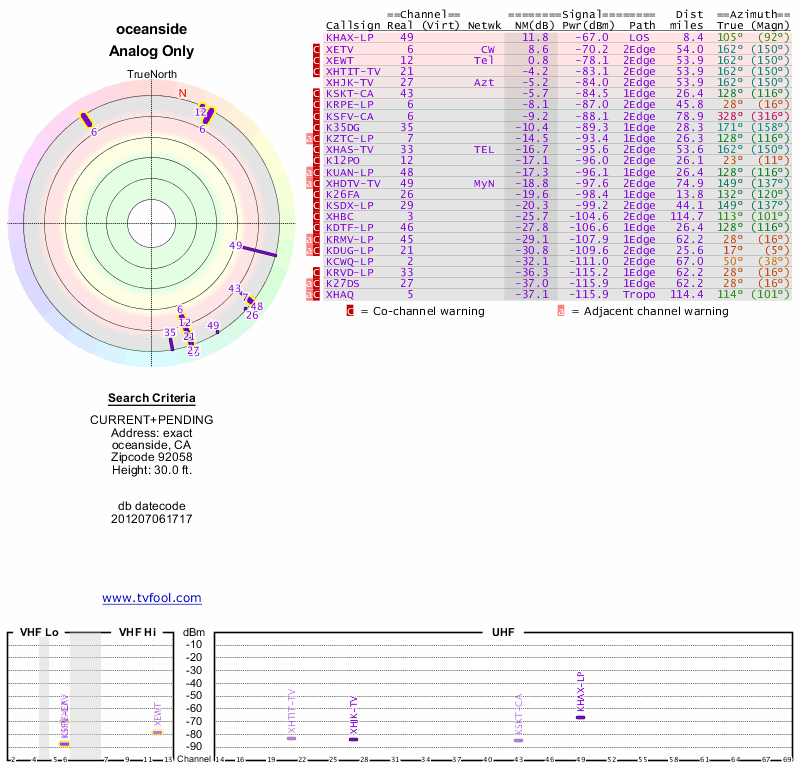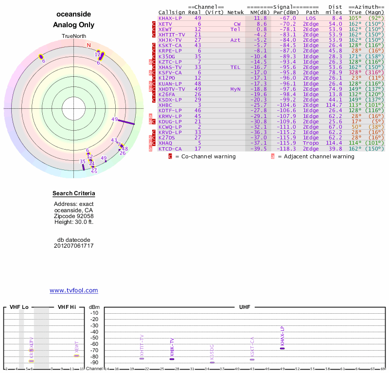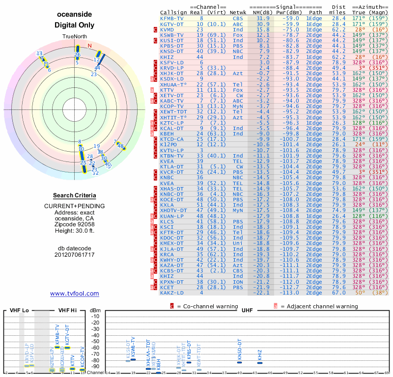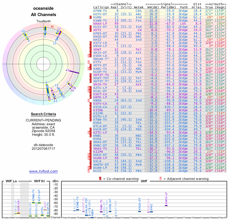 Here are the results for your location. The transmitter database was last updated on June 7, 2013. For more information about these plots and how to interpret them, please check out the Signal Analysis FAQ.