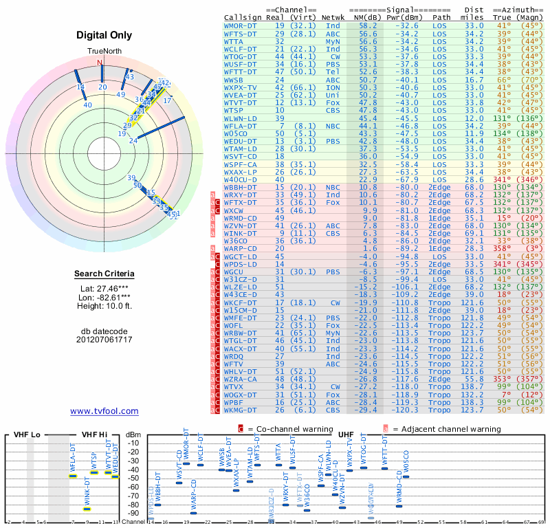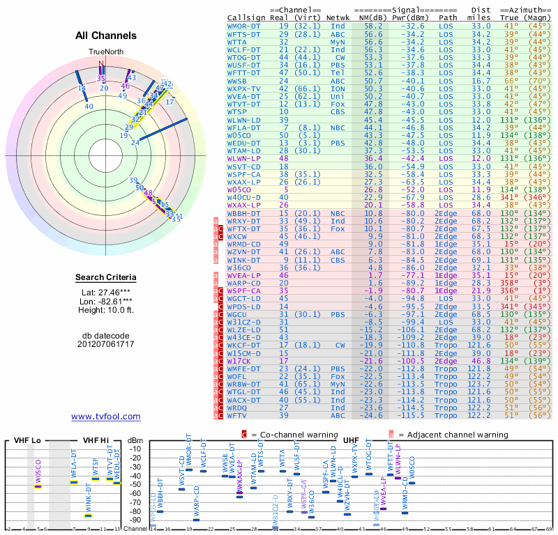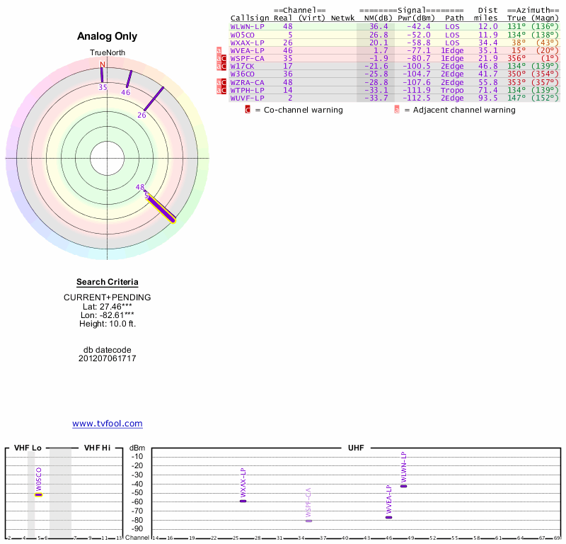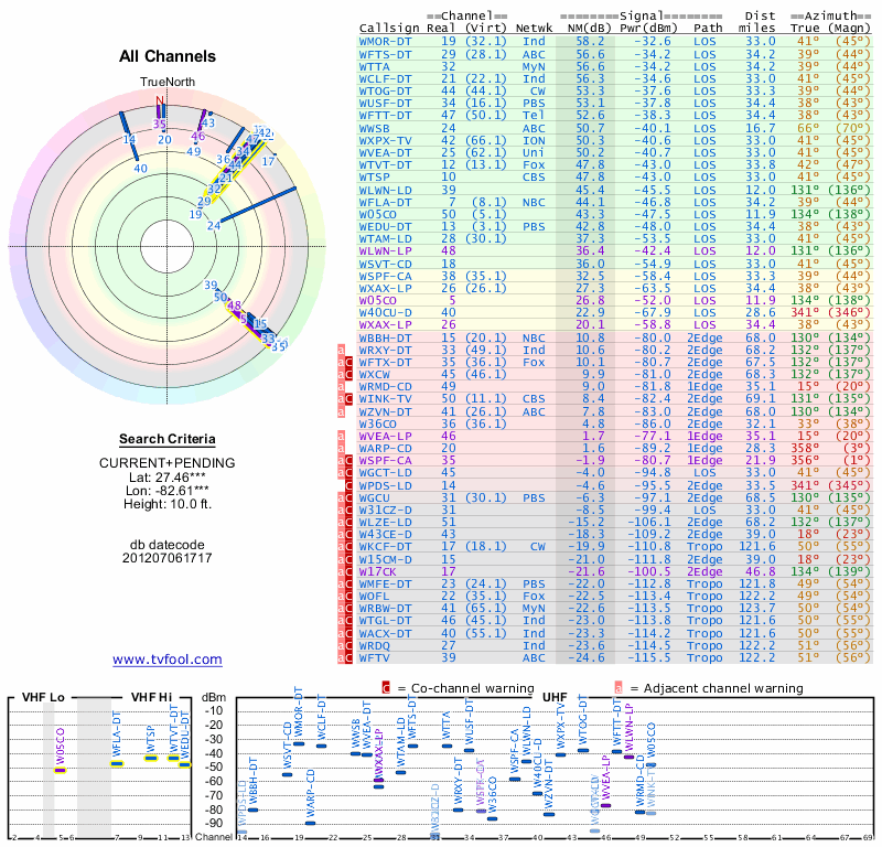 Here are the results for your location. The transmitter database was last updated on June 7, 2013. For more information about these plots and how to interpret them, please check out the Signal Analysis FAQ.