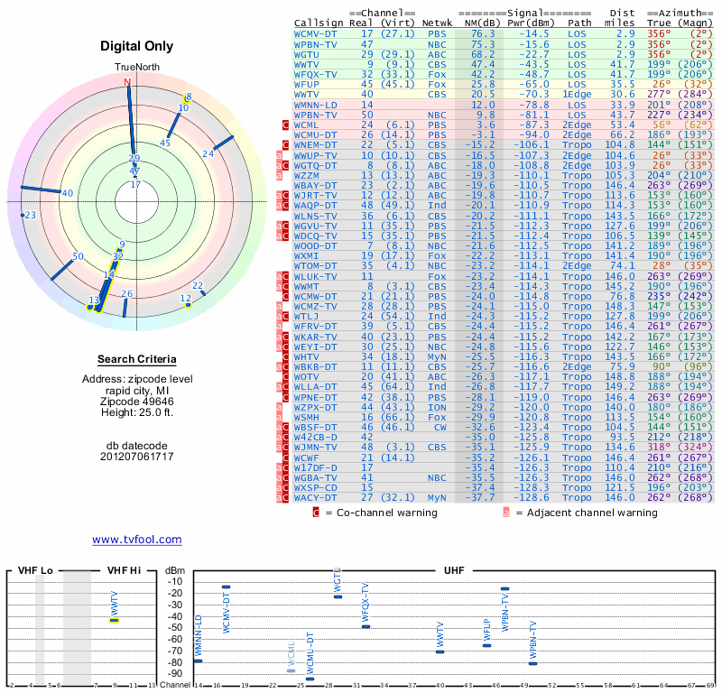 Here are the results for your location. The transmitter database was last updated on June 7, 2013. For more information about these plots and how to interpret them, please check out the Signal Analysis FAQ.