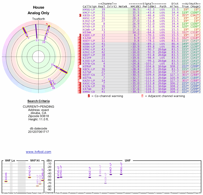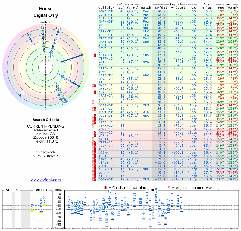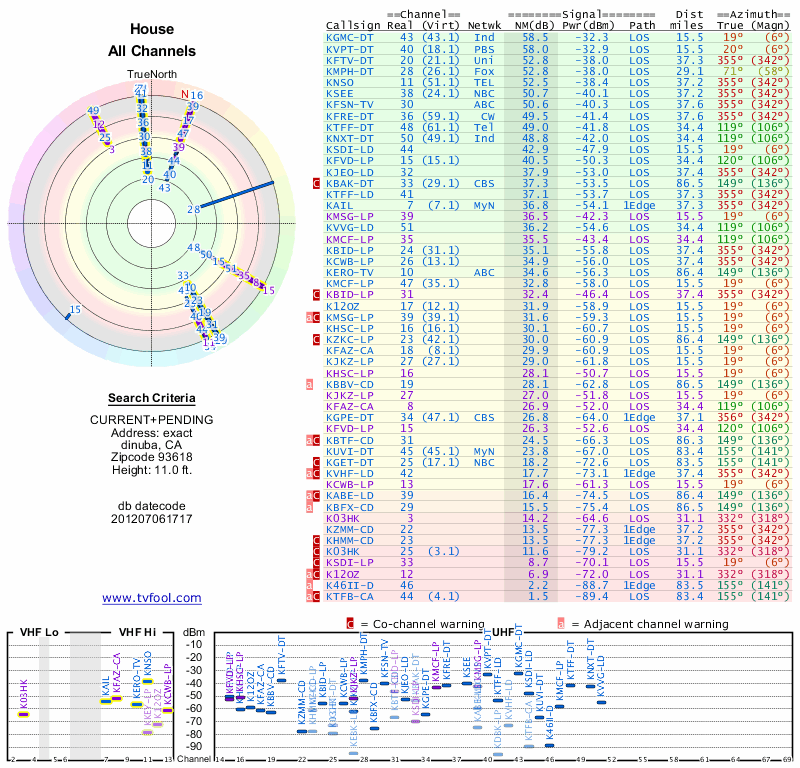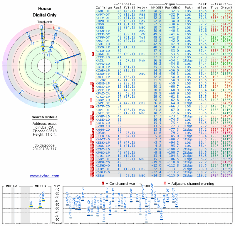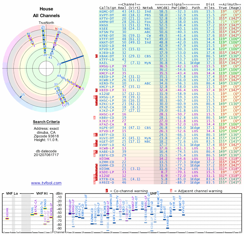Here are the results for your location. The transmitter database was last updated on June 7, 2013. For more information about these plots and how to interpret them, please check out the Signal Analysis FAQ.