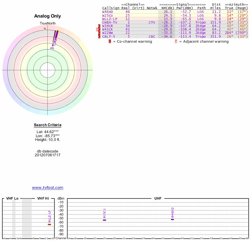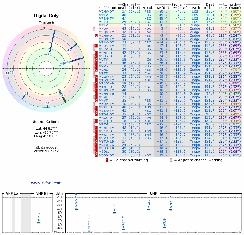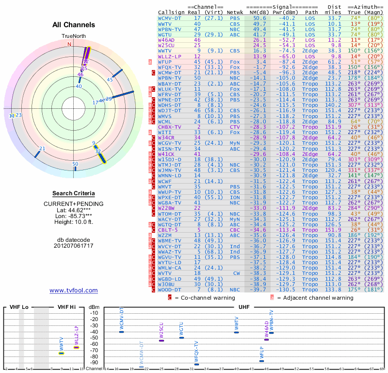 Here are the results for your location. The transmitter database was last updated on June 7, 2013. For more information about these plots and how to interpret them, please check out the Signal Analysis FAQ.