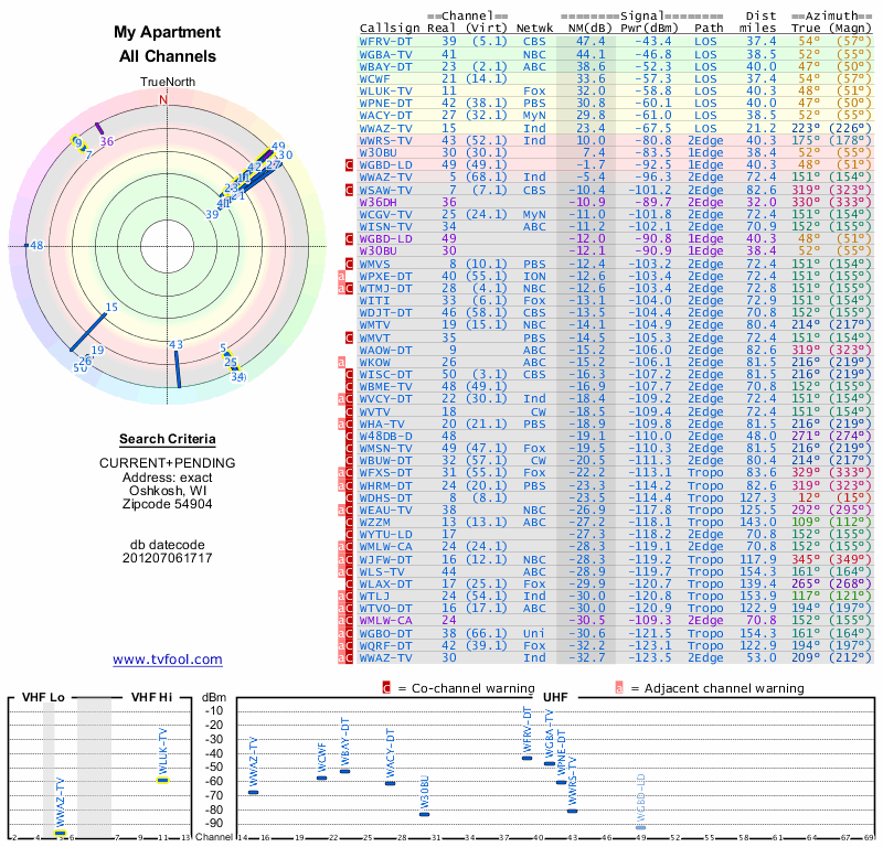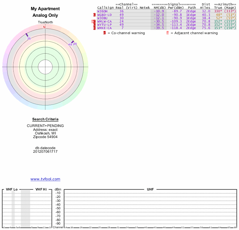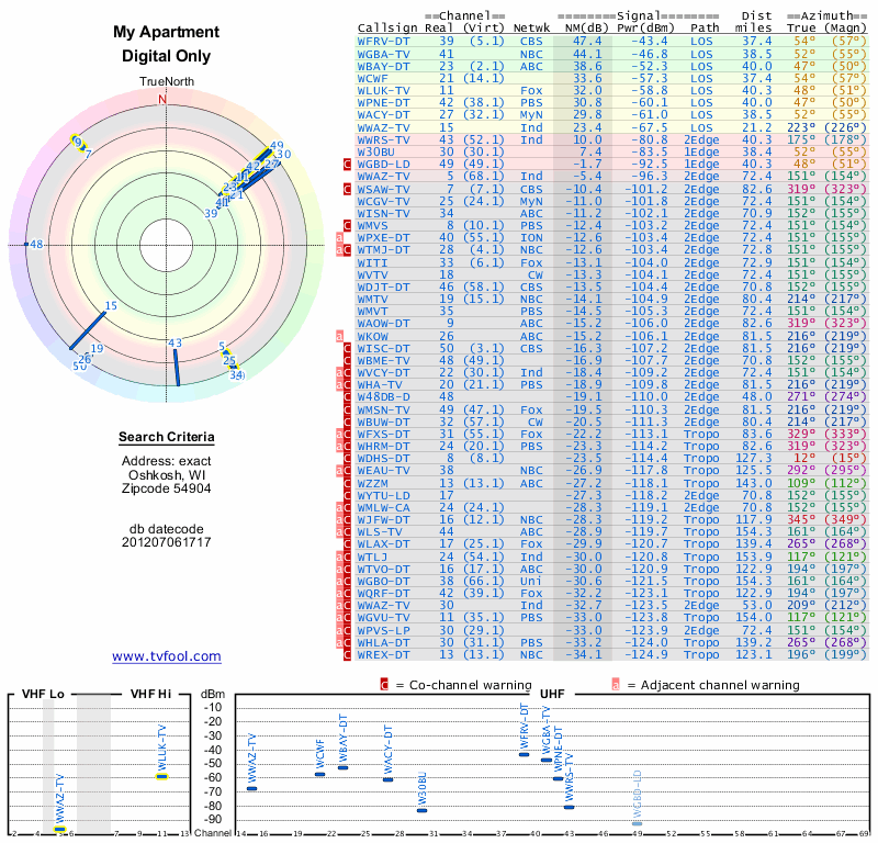 Here are the results for your location. The transmitter database was last updated on June 7, 2013. For more information about these plots and how to interpret them, please check out the Signal Analysis FAQ.
